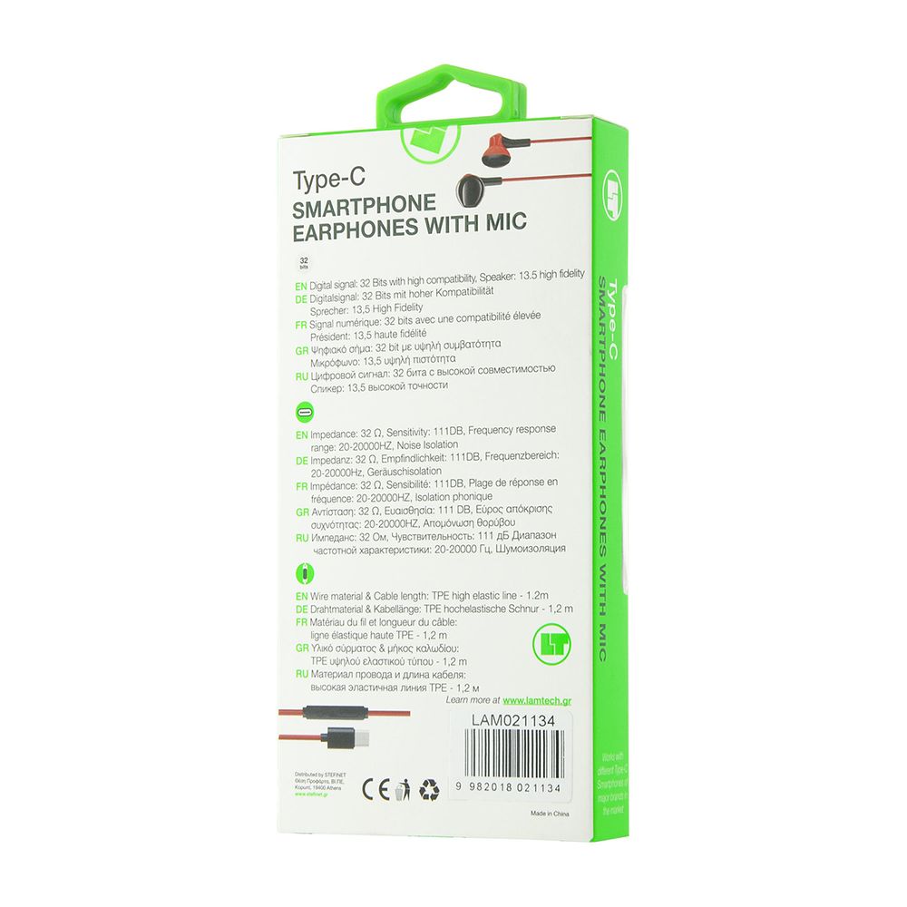 Ακουστικά In Ear της LAMTECH με σύνδεση Type C και Hi Res Audio 32bit, για καθαρή ποιότητα ήχου. Ιδανικά για μουσική ακρόαση και υψηλής ποιότητας επικοινωνία, λόγω της συνδεσιμότητας Type C, για όλoυς τους τύπους συσκευών (Smartphones, Tablets, Laptops). Διαθέτουν ενσωματωμένο μικρόφωνο, πλήκτρο αυξομείωσης έντασης ήχου και πλήκτρο ελέγχου κλήσεων και μουσικής.