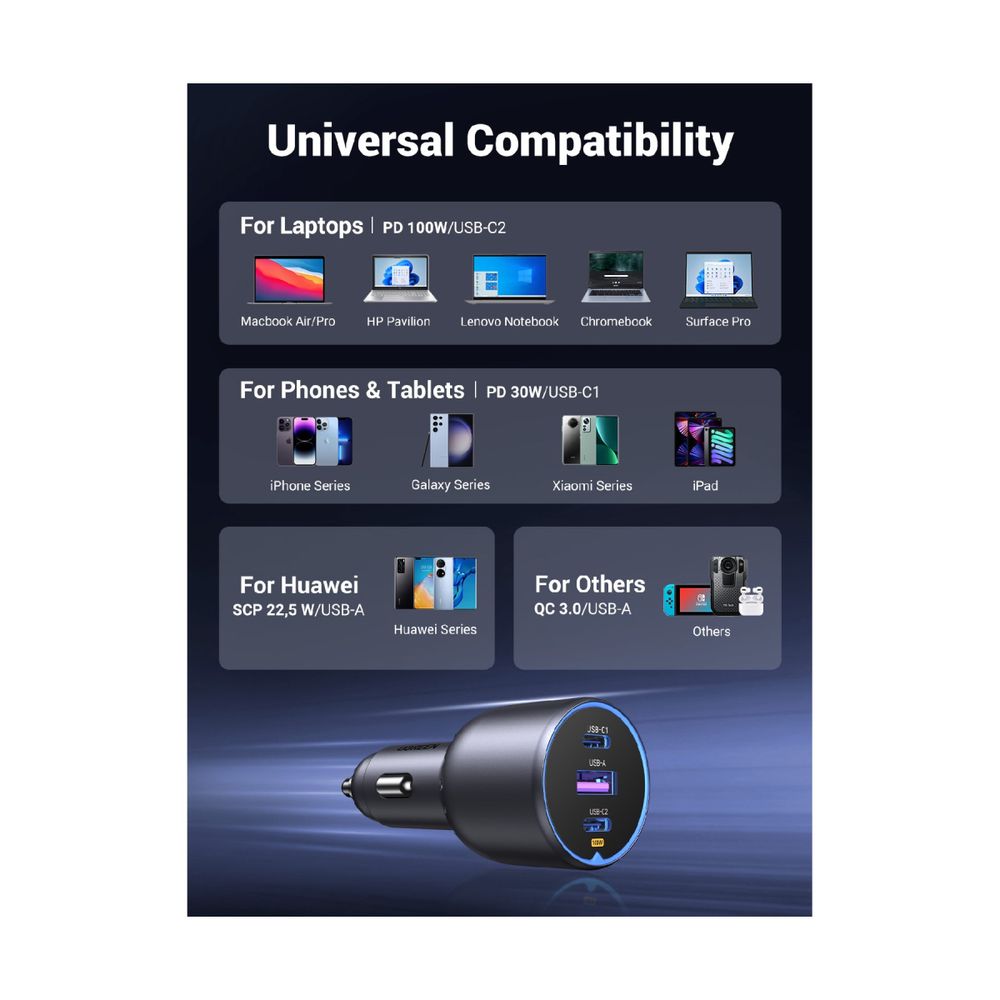 Ο Ugreen 130W 3-Port Γρήγορος Φορτιστής Αυτοκινήτου είναι η λύση για να πεις αντίο στους αργούς τρόπους φόρτισης. Με μία υποδοχή USB-A και δύο Type-C, μπορείς να φορτίζεις ταυτόχρονα έως και τρεις συσκευές, εξασφαλίζοντας ότι εσύ και οι συνεπιβάτες σου δεν θα ξεμείνετε ποτέ από μπαταρία. Με συνολική ισχύ 130W, κάθε συσκευή λαμβάνει την ενέργεια που χρειάζεται από το smartphone και το tablet σου, μέχρι το laptop ή ακόμα και το drone σου.