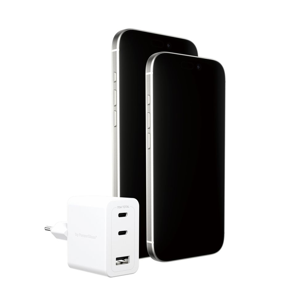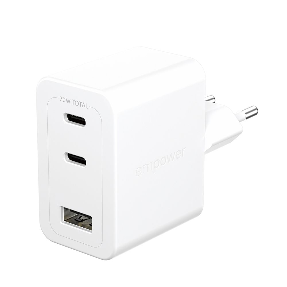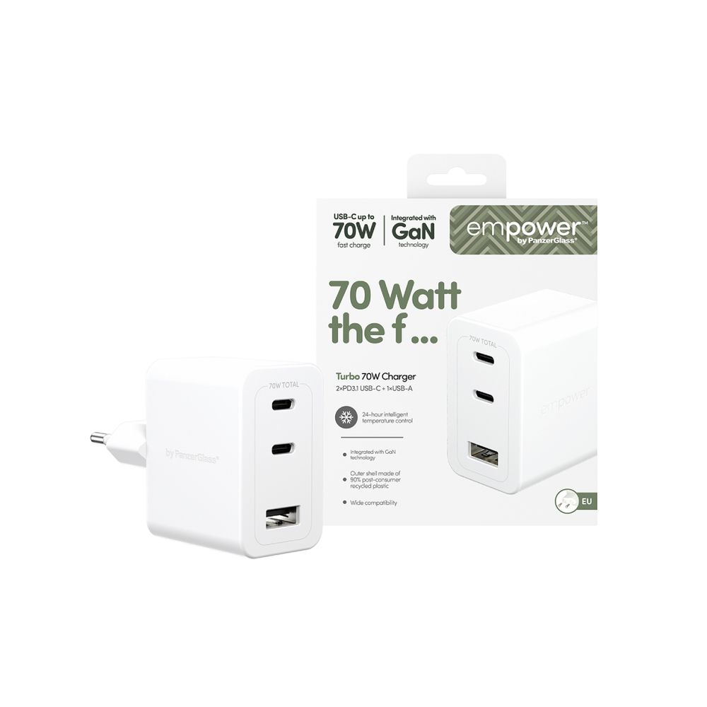 Φόρτισε smartphone, tablet ή laptop με τον empower by PanzerGlass Turbo 70W. Με δύο θύρες USB-C και μία USB-A, προσφέρει γρήγορη φόρτιση έως 70W, ιδανική για όλες σου τις συσκευές. Ενσωματώνει τεχνολογία GaN για υψηλή απόδοση και είναι κατασκευασμένος από 75% ανακυκλωμένο πλαστικό.
