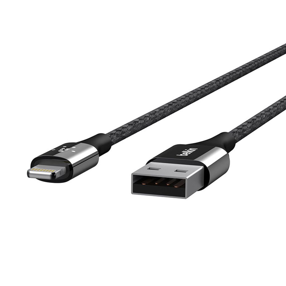 Καλώδιο Belkin Lightning 2.4A με ενίσχυση Kevlar για πρόσθετη αντοχή, περίβλημα από ελαστικό nylon διπλής πλέξης, μεγαλύτερη αντοχή στην κάμψη, περίβλημα αλουμινίου στο βύσμα, υποστηρίζει φόρτιση 12W/2.4A, μήκος 1.2 μέτρα και πιστοποίηση MFi.