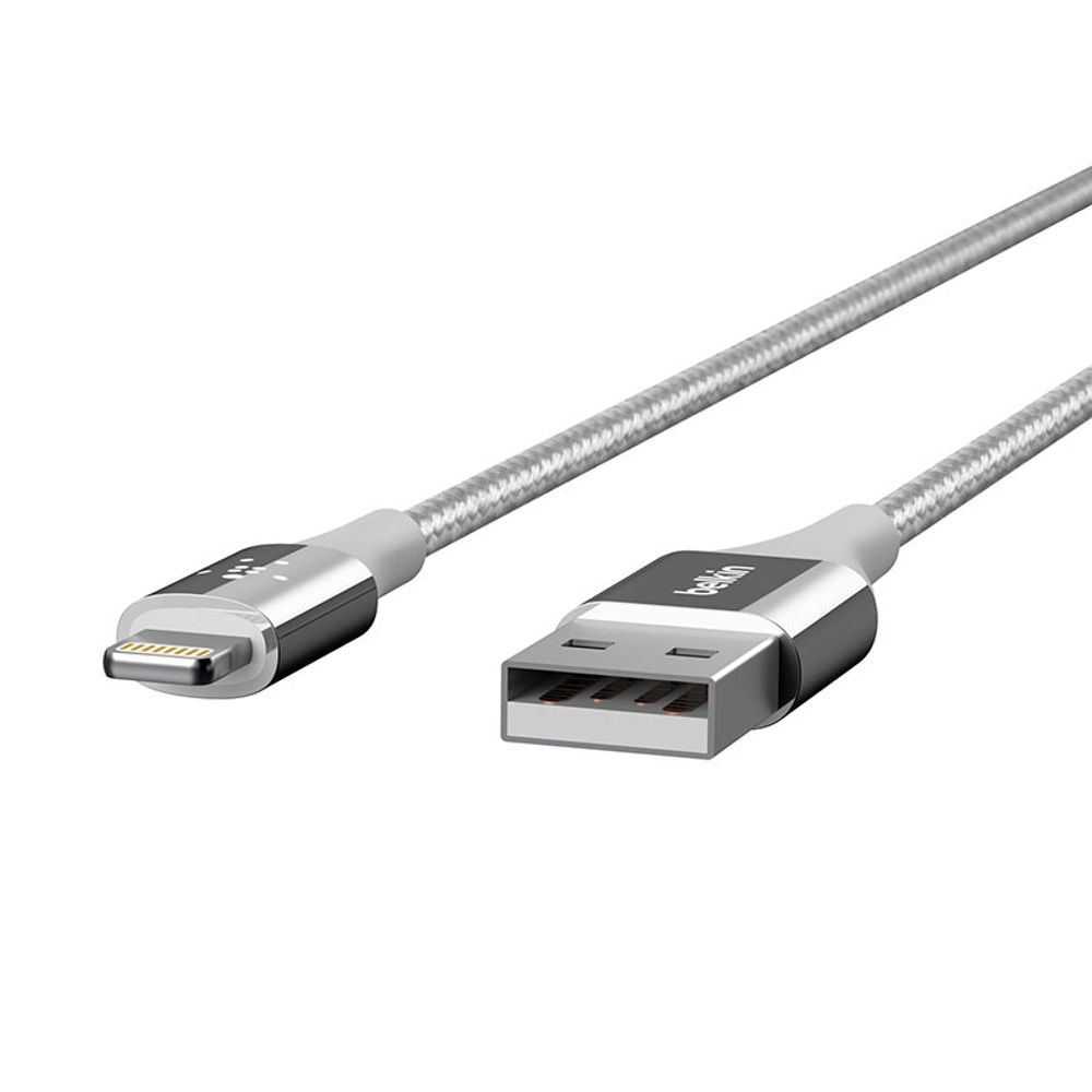 Καλώδιο Belkin Lightning 2.4A με ενίσχυση Kevlar για πρόσθετη αντοχή, περίβλημα από ελαστικό nylon διπλής πλέξης, μεγαλύτερη αντοχή στην κάμψη, περίβλημα αλουμινίου στο βύσμα, υποστηρίζει φόρτιση 12W/2.4A, μήκος 1.2 μέτρα και πιστοποίηση MFi.