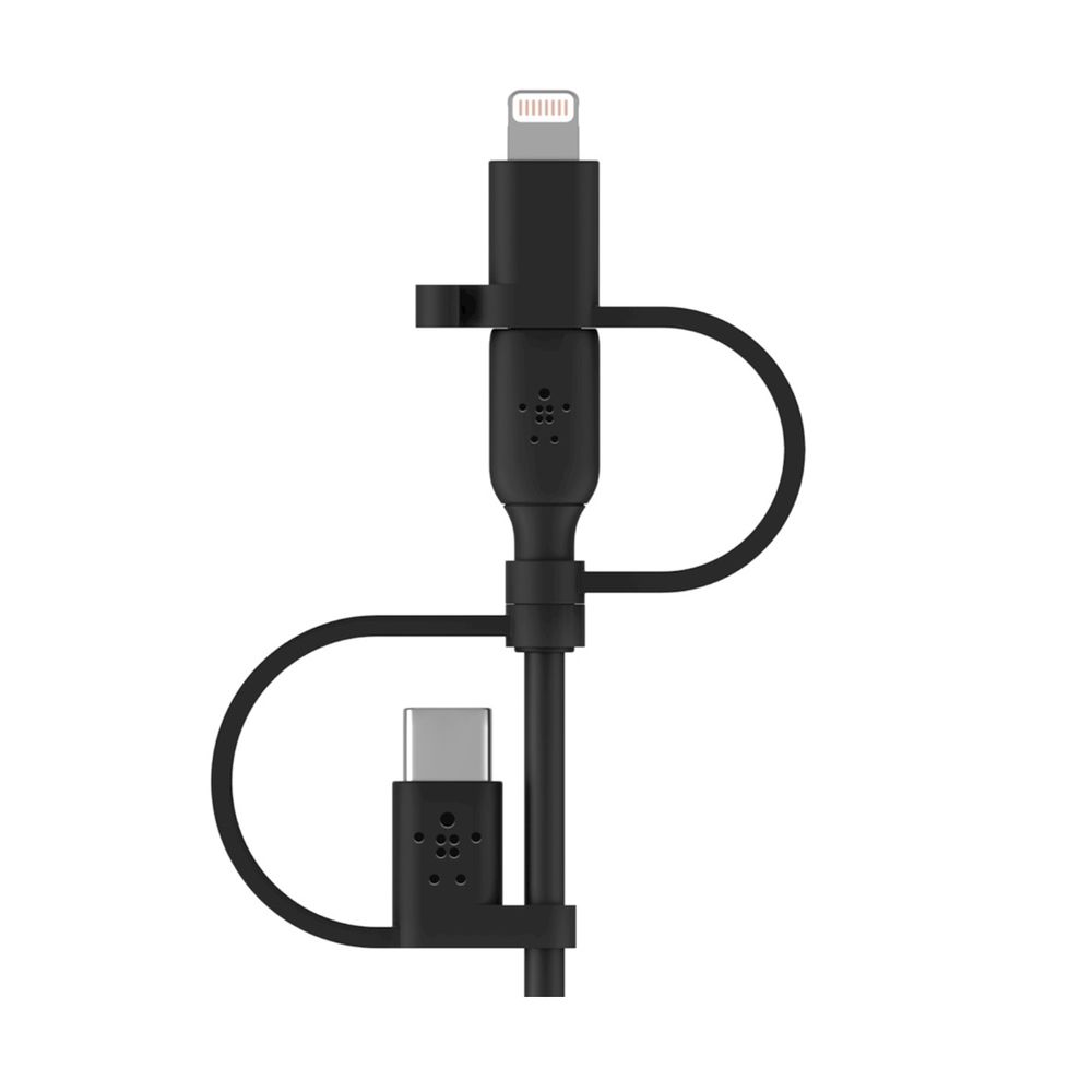 Καλώδιο all-in-one USB-A με υποδοχές USB-C, Micro-USB και Lightning, από τη Belkin. Τα άγκιστρα διαχείρισης καλωδίων διατηρούν τα καλώδια οργανωμένα, ενώ η πιστοποίηση MFi εξασφαλίζει συμβατότητα με συσκευές Apple. Το μήκος του καλωδίου είναι 1 m .