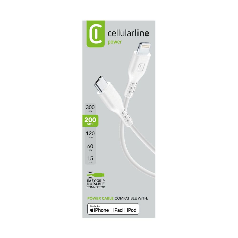Το καλώδιο τροφοδοσίας 200cm της Cellular Line είναι εξοπλισμένο με βύσμα USB-C, το οποίο καταλήγει σε Lightning για την φόρτιση και μεταφορά δεδομένων σε διάφορες συσκευές της Apple. Σχεδιασμένο για εύκολη και ασφαλή φόρτιση, το καλώδιο τροφοδοσίας της Cellular Line είναι το απαραίτητο αξεσουάρ για το κινητό σου