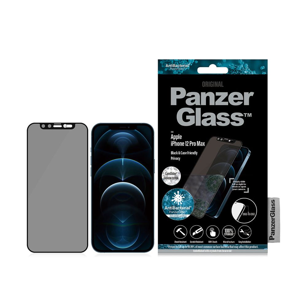 Το PanzerGlass Edge-to-Edge για το Apple iPhone 12 Pro Max προσφέρει τη μέγιστη προστασία για ολόκληρη την εμπρός επιφάνεια της συσκευής όσο και για το περιεχόμενο της οθόνης. Ένα ειδικό φίλτρο (privacy filter) καθιστά το περιεχόμενο της οθόνης σχεδόν αόρατο σε όλους, εκτός από τον χρήστη της συσκευής. Ταυτόχρονα, μειώνει την έκθεση στο μπλε φως και διαθέτει αντιολισθητική επίστρωση, η οποία μειώνει τις ανακλάσεις του φωτός που φτάνουν στα μάτια χωρίς να επηρεάζεται η ορατότητα της οθόνης.