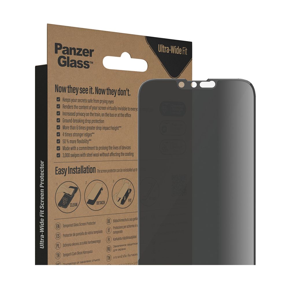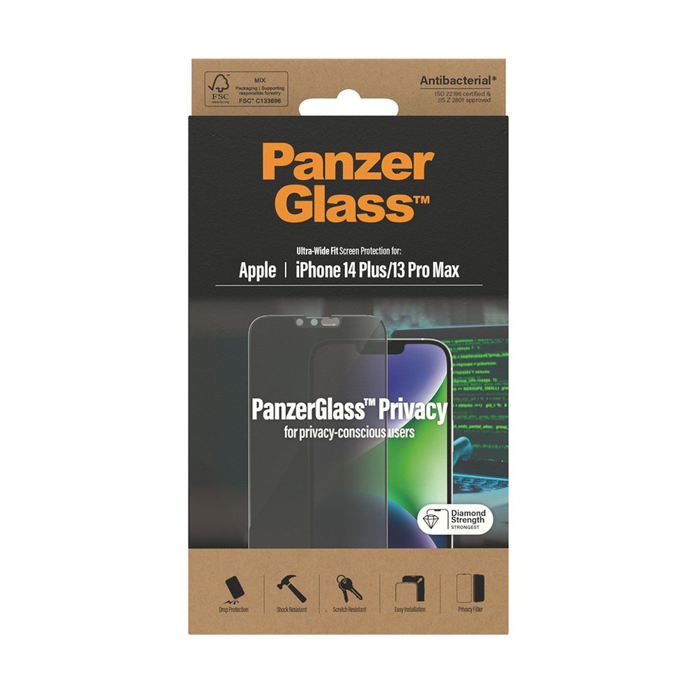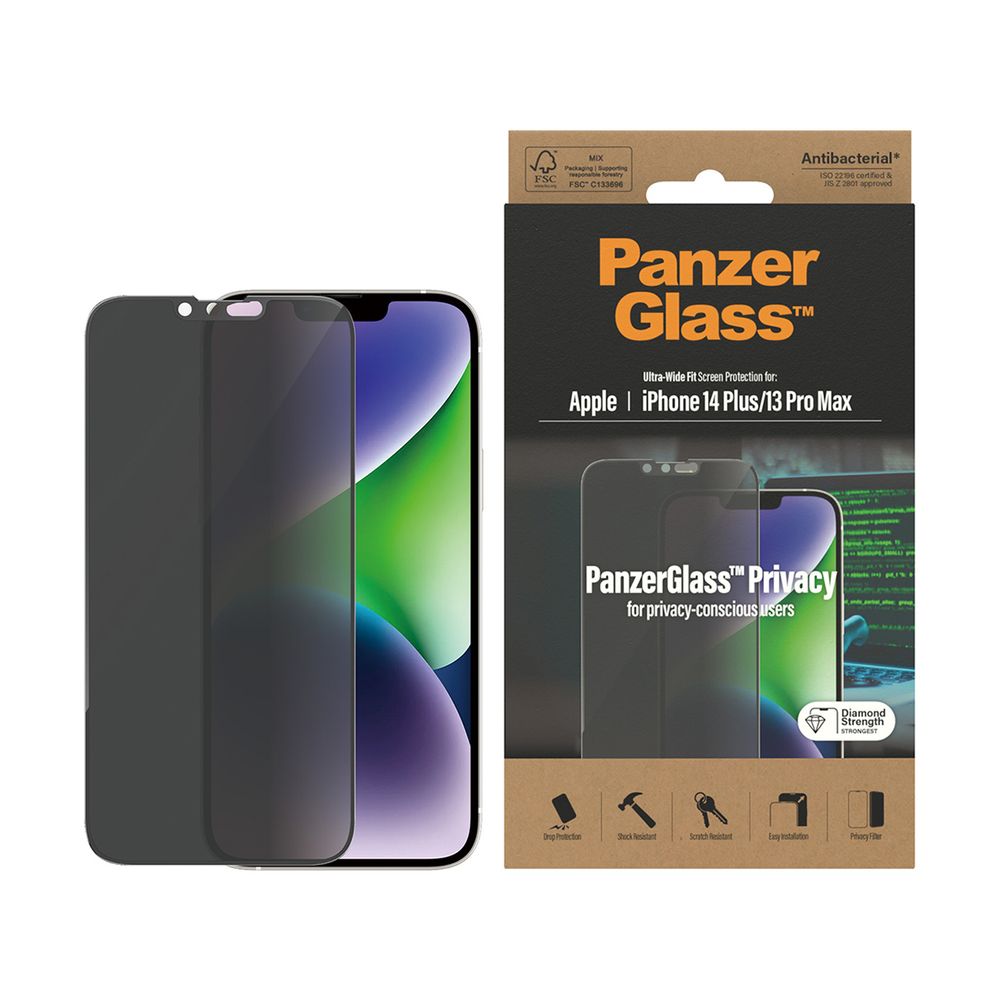 Το ΑntiBacterial Ultra-Wide Fit Privacy προστατευτικό γυαλί οθόνης με ειδικά σχεδιασμένο φίλτρο απορρήτου της PanzerGlass, αντιπροσωπεύει την πιο προηγμένη προστασία και το ιδανικότερο φινίρισμα για το iPhone 14 Plus και το iPhone 13 Pro Max. Με Diamond Glass ισχυρό γυαλί, η Ultra-Wide Fit προσφέρει πρωτοποριακή προστασία για χτυπήματα σε αιχμηρά αντικείμενα και πτώσεις υψηλού επιπέδου ενώ με την αντιβακτηριδιακή του ιδιότητα μεγιστοποιεί την προστασία από τα βακτήρια.