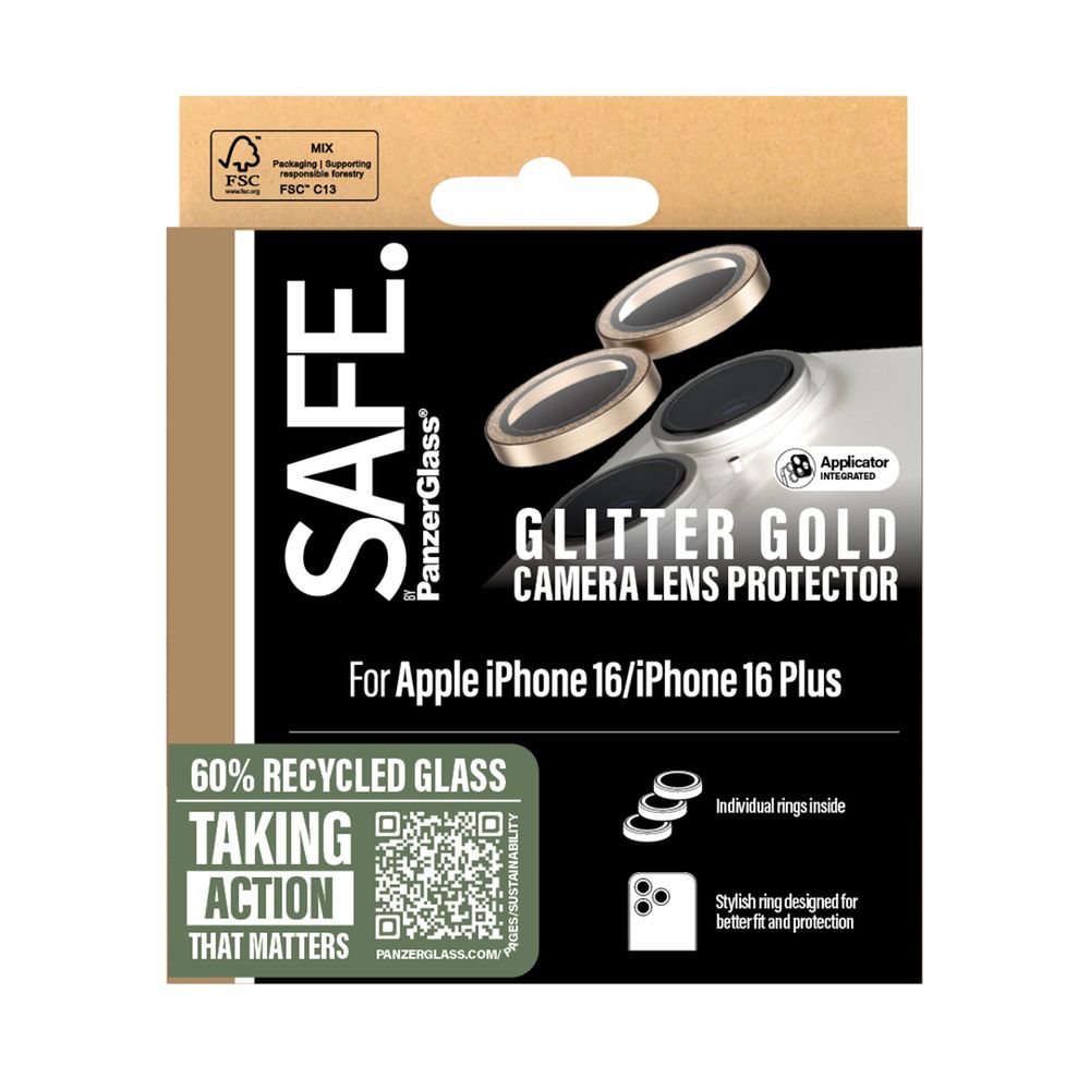Όλοι αξίζουν να νιώθουν SAFE. και όμορφοι! Αυτά τα χρυσά οπτικά δαχτυλίδια glitter από την SAFE. by PanzerGlass είναι φτιαγμένα για να προστατεύουν και να εντυπωσιάζουν! Οι γρατσουνιές και οι πτώσεις δεν έχουν καμία τύχη! Και αν σκέφτεσαι "Τι γίνεται με τις φωτογραφίες μου;" Μπορείς να είσαι ήσυχος: Θα είναι τόσο καθαρές και ευκρινείς όσο έχεις συνηθίσει!