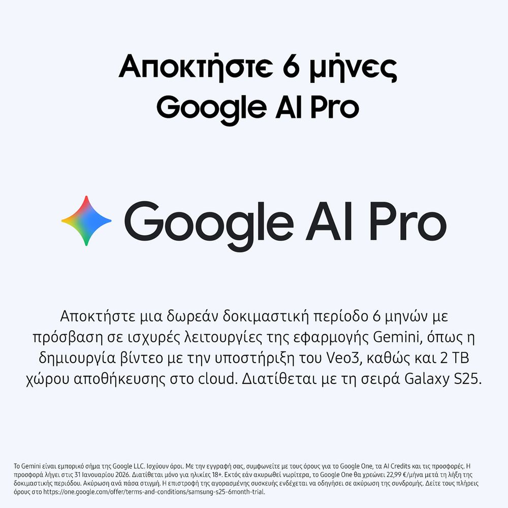 Το Samsung Galaxy S25 FE προσφέρει ισορροπία δύναμης και κομψότητας, με οθόνη 6,7” Dynamic AMOLED 2X FHD+ 120Hz για φωτεινή και καθαρή εικόνα. Ο Exynos 2400 χαρίζει υψηλές επιδόσεις και σταθερό gaming, ενώ η μπαταρία 4.900 mAh με ταχεία φόρτιση 45W και ασύρματη 15W σε στηρίζει όλη μέρα. Το τριπλό σύστημα καμερών 50MP με ProVisual Engine εξασφαλίζει πορτρέτα και selfie γεμάτα λεπτομέρεια, ενώ οι AI λειτουργίες Galaxy AI & Gemini αναβαθμίζουν κάθε εμπειρία με ευφυΐα και δημιουργικότητα.