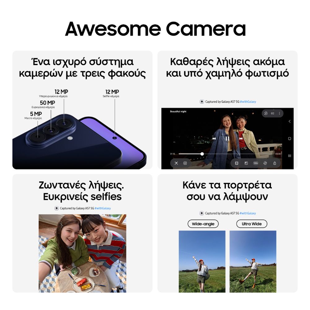 Το Samsung Galaxy A57 5G συνδυάζει κομψό, λεπτό σχεδιασμό με ισχυρά χαρακτηριστικά για την καθημερινότητά σου. Το γυαλιστερό φινίρισμα και η εντυπωσιακή τριπλή κάμερα με ημιδιαφανές εφέ ξεχωρίζουν, ενώ η μεγάλη AMOLED οθόνη και η υποστήριξη 5G σου προσφέρουν άνετη και γρήγορη εμπειρία χρήσης. Παράλληλα, η ισχυρή μπαταρία και η ομαλή απόδοση καλύπτουν κάθε σου ανάγκη μέσα στη μέρα.