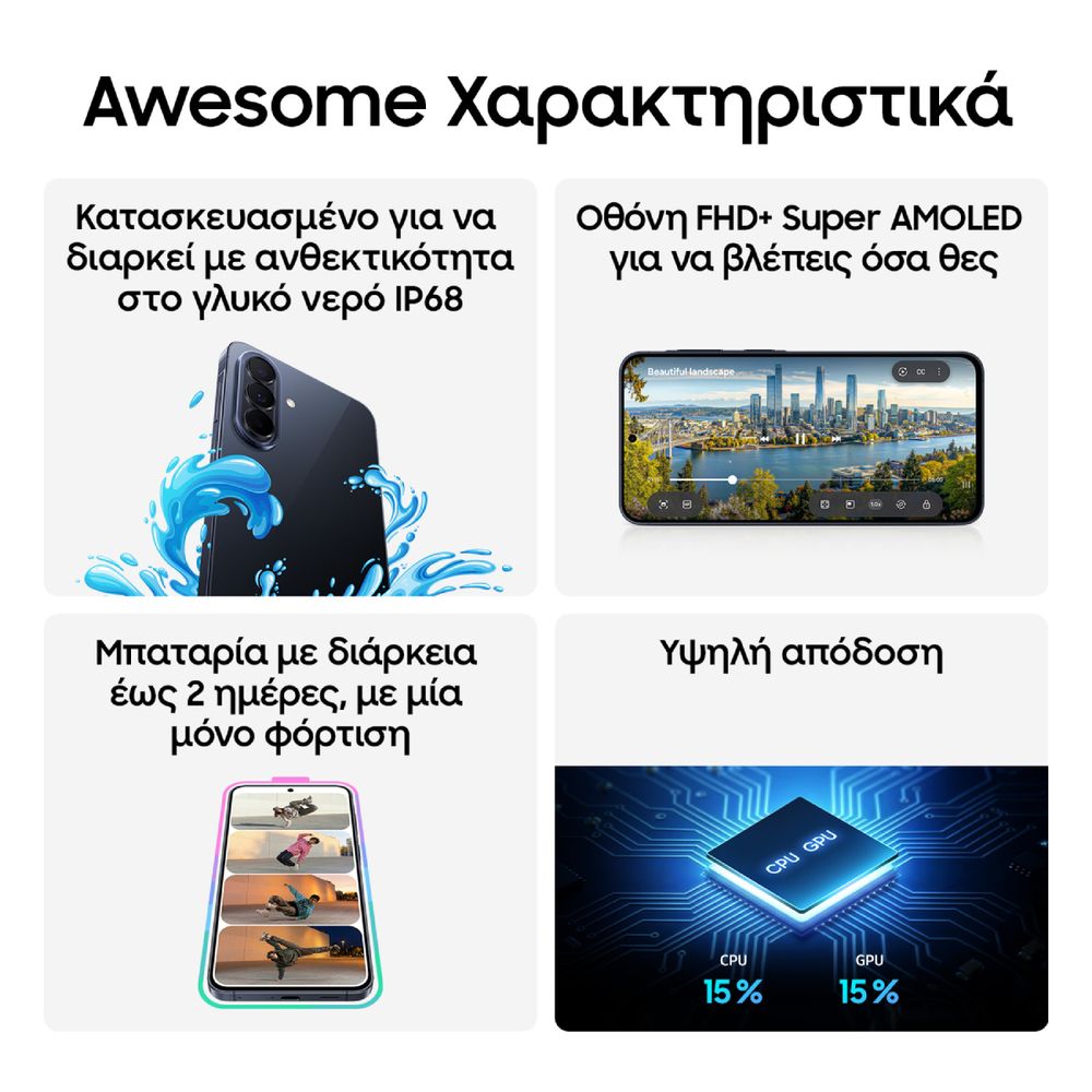 Το Samsung Galaxy A57 5G συνδυάζει κομψό, λεπτό σχεδιασμό με ισχυρά χαρακτηριστικά για την καθημερινότητά σου. Το γυαλιστερό φινίρισμα και η εντυπωσιακή τριπλή κάμερα με ημιδιαφανές εφέ ξεχωρίζουν, ενώ η μεγάλη AMOLED οθόνη και η υποστήριξη 5G σου προσφέρουν άνετη και γρήγορη εμπειρία χρήσης. Παράλληλα, η ισχυρή μπαταρία και η ομαλή απόδοση καλύπτουν κάθε σου ανάγκη μέσα στη μέρα.