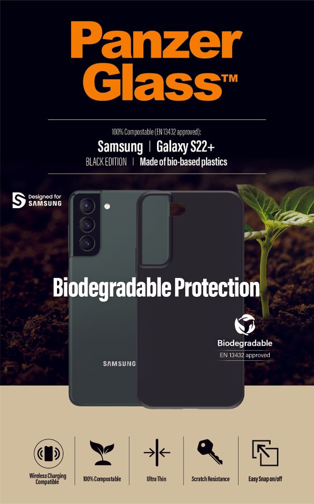 Πρόσθεσε εξαιρετικά λεπτή και κομψή προστασία στο Samsung Galaxy S22+ με τη βιοδιασπώμενη θήκη PanzerGlass. Με κομψό μαύρο σχεδιασμό που θα αντέξει στη δοκιμασία του χρόνου, η Βιοδιασπώμενη θήκη επιτρέπει στη συσκευή σας να είναι κομψή και προστατευμένη. Η Βιοδιασπώμενη θήκη είναι κατασκευασμένη από πλαστικό βιολογικής βάσης και είναι 100 % κομποστοποιήσιμη (Εγκεκριμένο EN 13432). Η θήκη απορροφά τις κρούσεις ενώ παρέχει πρόσβαση σε όλες τις σημαντικές λειτουργίες της συσκευής.