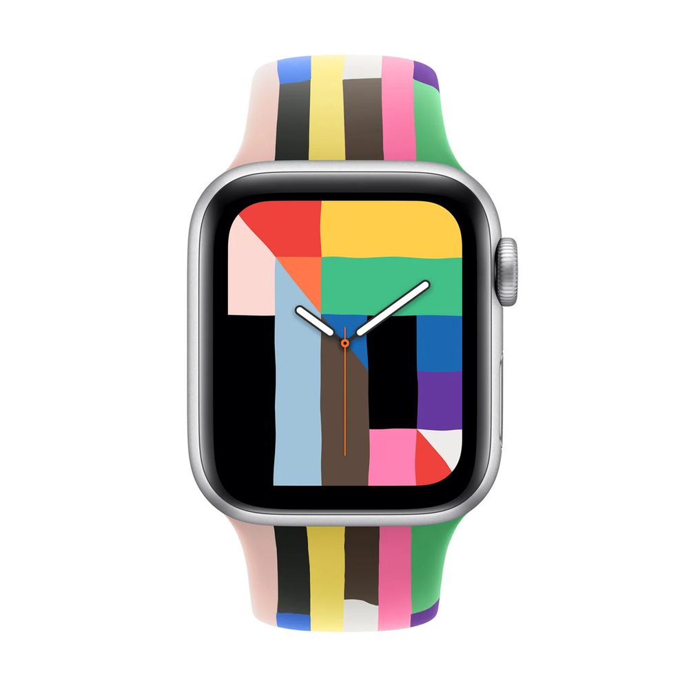 Το Pride Edition Sport Band διαθέτει ζωηρές ρίγες ουράνιου τόξου, που είναι εμπνευσμένος από την παλέτα χρωμάτων πολλών σημαιών του Pride. Κάθε λωρίδα είναι κατασκευασμένη από μεμονωμένες ρίγες υψηλής απόδοσης φθοροελαστομερούς, ενώ το καινοτόμο κούμπωμα τύπου pin-and-tuck φέρει χάραξη με λέιζερ.