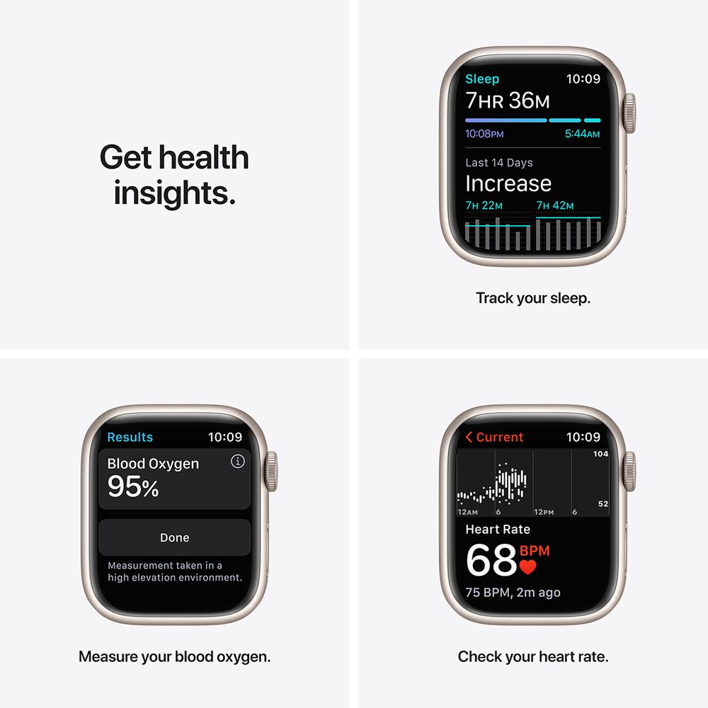 Η μεγαλύτερη, πιο προηγμένη Always-On Retina οθόνη κάνει τα πάντα να φαίνονται μεγαλύτερα και καλύτερα στο Apple Watch Series 7. Η νέα σειρά εισάγει το πιο ανθεκτικό Apple Watch που κατασκευάστηκε ποτέ με έναν ακόμα πιο ισχυρό κρύσταλλο. Οι προηγμένες λειτουργίες που ενσωματώνει, σού επιτρέπουν να μετράς το επίπεδο οξυγόνου στο αίμα σου, να πραγματοποιείς ΗΚΓ οποιαδήποτε στιγμή, και να έχεις πρόσβαση σε εφαρμογές παρακολούθησης της υγείας σου. Μπορείς επίσης να παρακολουθείς δεκάδες προπονήσεις, όπως των νέων tai chi και pilates.