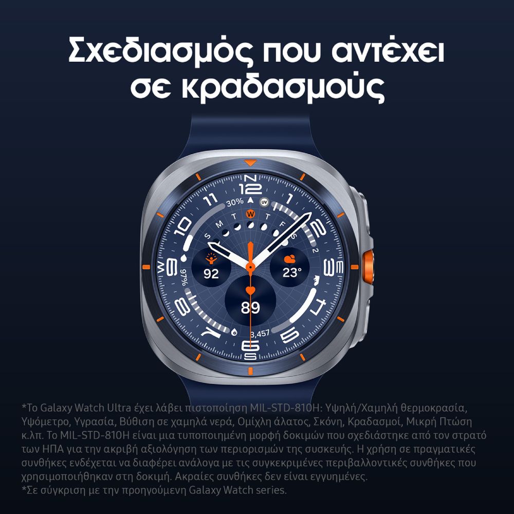 Το Galaxy Watch Ultra διαθέτει οθόνη 1.47” s-AMOLED με φωτεινότητα έως 3000 nits και σώμα από τιτάνιο για κορυφαία ανθεκτικότητα. Η μπαταρία των 590mAh προσφέρει μεγάλη διάρκεια, ενώ ο επεξεργαστής Exynos W1000 (5 Core, 3nm) εξασφαλίζει ισχυρή απόδοση. Με 64GB αποθηκευτικό χώρο και ανθεκτικότητα 10ATM, IP68 και MIL-STD-810H, είναι ιδανικό για εξωτερικές δραστηριότητες. Διαθέτει μικρόφωνο, ηχείο, σειρήνα και Quick Button.