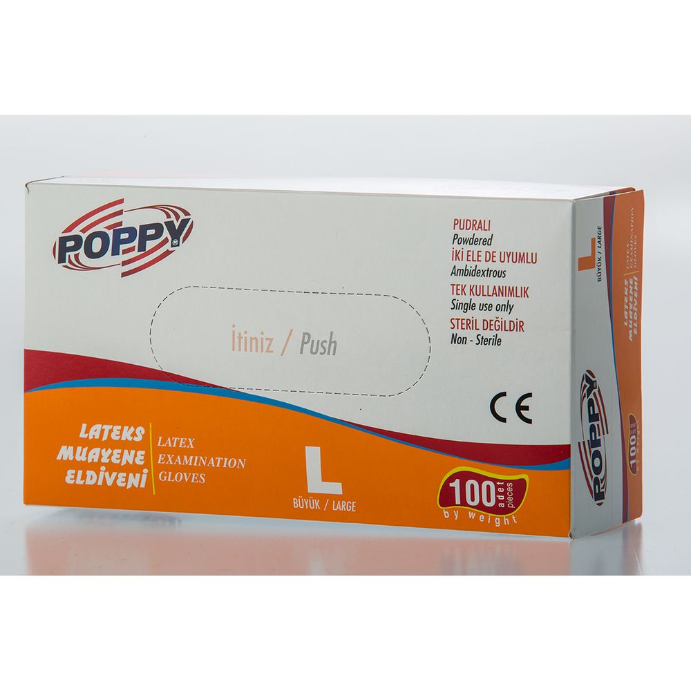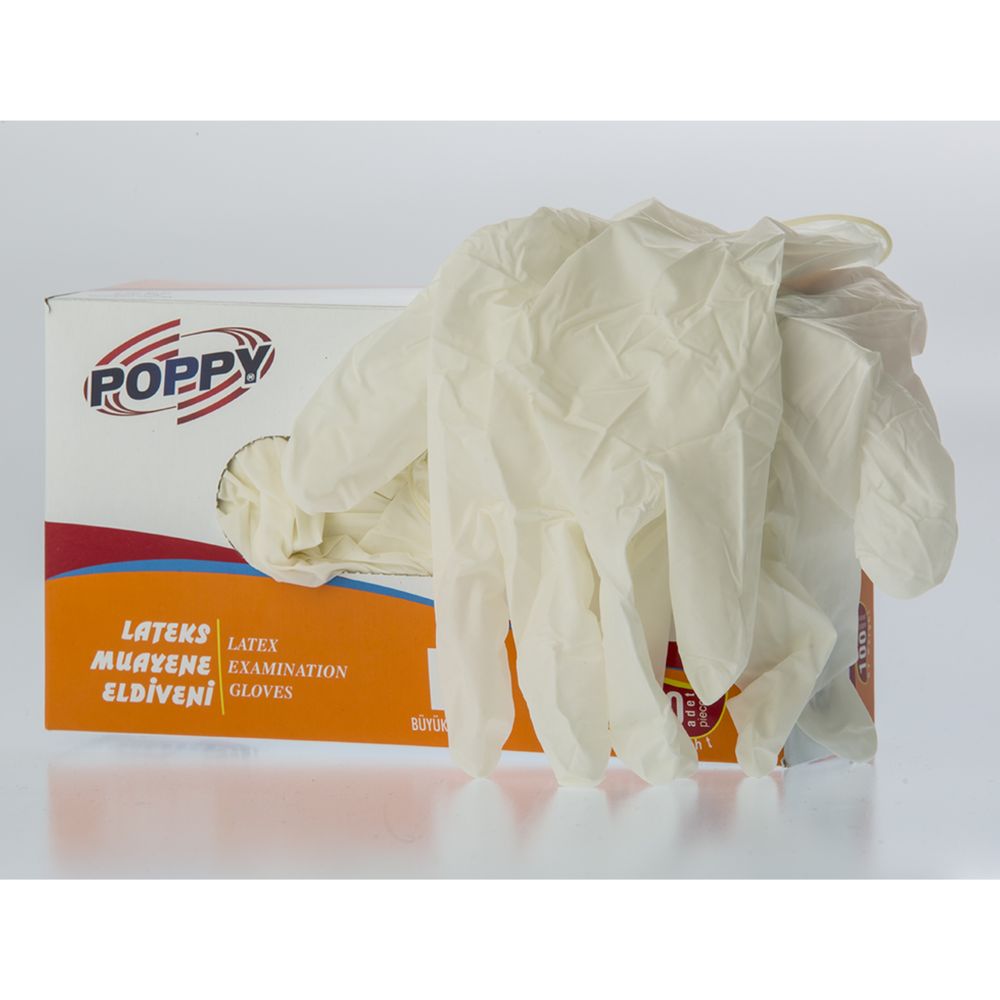 Συσκευασία με 100 τεμάχια Poppy Latex γάντια προστασίας με πούδρα μίας χρήσης, σε λευκή απόχρωση και Large μέγεθος.