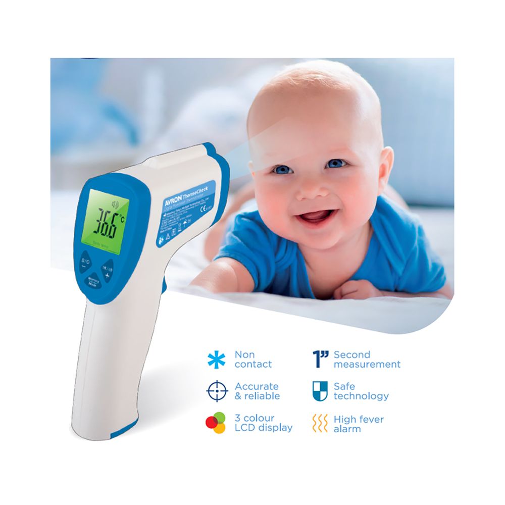 Το ανέπαφο ψηφιακό θερμόμετρο μετώπου Avron ThermoCheck, προσφέρει εύκολη και ανέπαφη μέτρηση θερμοκρασίας από το μέτωπο σε μόλις 1 δευτερόλεπτο, με την ακρίβεια και την αξιοπιστία την AVRON. Διαθέτει μεγάλη φωτιζόμενη οθόνη LCD με 3 χρώματα και διαβάθμιση αποτελέσματος της μέτρησης. Με οπτικό και ηχητικό συναγερμό πυρετού, διαθέτει μνήμη 32 μετρήσεων και είναι κατάλληλο για όλες τις ηλικίες. Επίσης, προσφέρει τη δυνατότητα μέτρησης θερμοκρασίας αντικειμένων πχ γάλα αλλά και του δωματίου.