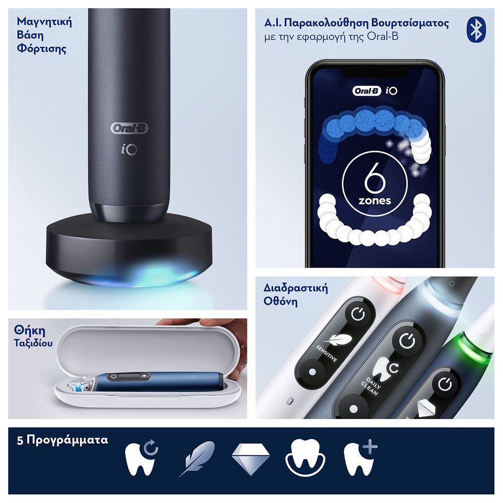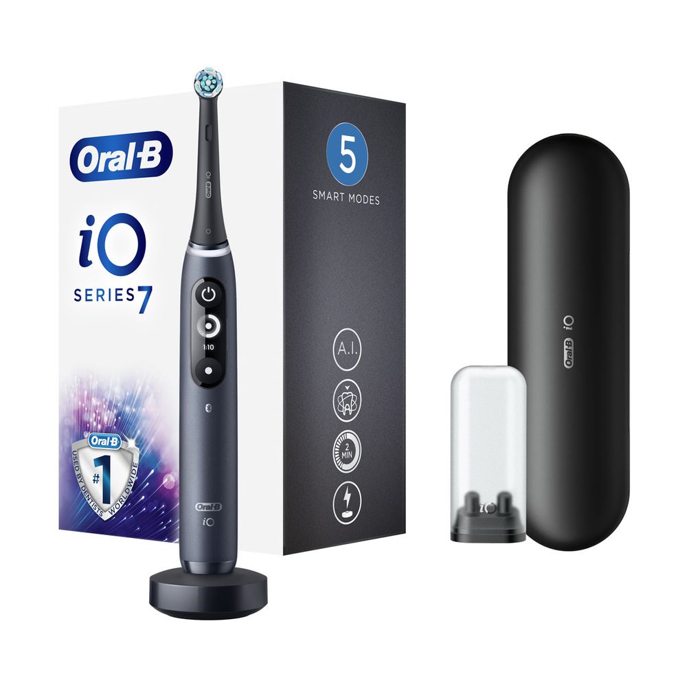 Περιλαμβάνει: ,1 μαύρη iO7 λαβή με κεφαλή βουρτσίσματος Ultimate Clean ,1 θήκη ταξιδίου ,1 βάση αποθήκευσης κεφαλής βουρτσίσματος με καπάκι ,1 μαγνητική βάση φόρτισης