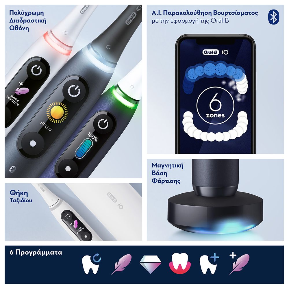 Περιλαμβάνει: 1 μαύρη iO8 λαβή με κεφαλή βουρτσίσματος Ultimate Clean, 1 premium θήκη ταξιδίου, 1 βάση αποθήκευσης κεφαλής βουρτσίσματις με καπάκι, 1 μαγνητικό φορτιστή