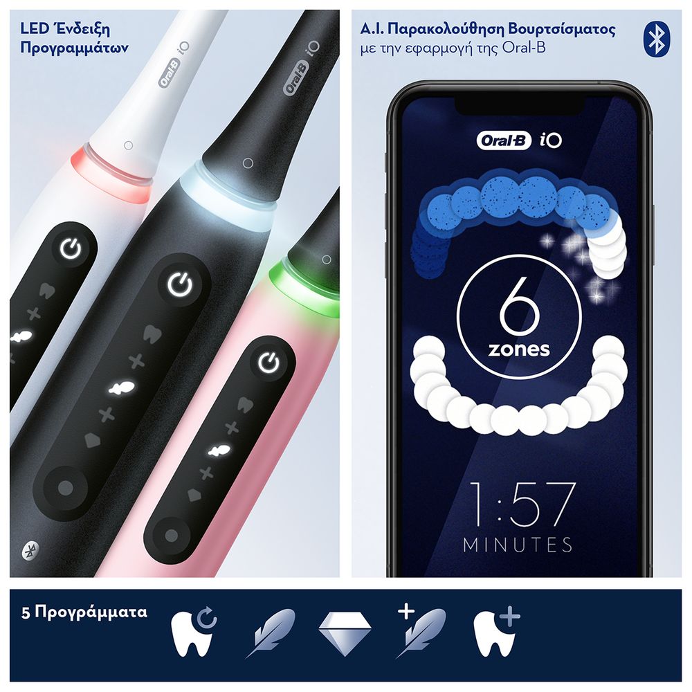Η ηλεκτρική οδοντόβουρτσα iO 5 συνδυάζει μια στρογγυλή κεφαλή εμπνευσμένη από οδοντιάτρους με ίνες μικροδονήσεων για επαγγελματική αίσθηση απόλυτου καθαρισμού στο σπίτι. Ο Έξυπνος Αισθητήρας Πίεσης σε βοηθά να μην βουρτσίζεις ούτε πολύ δυνατά ούτε πολύ απαλά για καλύτερη προστασία των ούλων. Η Αναγνώριση Βουρτσίσματος με τεχνητή νοημοσύνη αναγνωρίζει το στυλ βουρτσίσματος και σε καθοδηγεί ώστε να βουρτσίζεις τα δόντια σου κάθε μέρα καλύτερα.