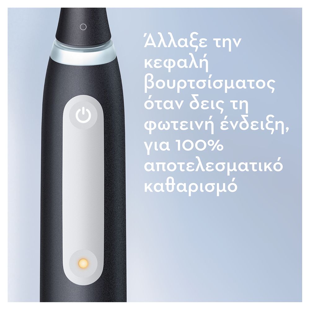 Η ηλεκτρική οδοντόβουρτσα iO 4 διαθέτει προηγμένη τεχνολογία της Oral-B, που συνδυάζει μια στρογγυλή κεφαλή εμπνευσμένη από οδοντιάτρους με ίνες μικροδονήσεων για επαγγελματική αίσθηση απόλυτου καθαρισμού στο σπίτι. Ο Έξυπνος Αισθητήρας Πίεσης σε βοηθά να μην βουρτσίζεις ούτε πολύ δυνατά ούτε πολύ απαλά για καλύτερη προστασία των ούλων σου. Η λειτουργία Προστασία των ούλων σε ειδοποιεί για τον χρόνο που βούρτσισες με υπερβολική πίεση.