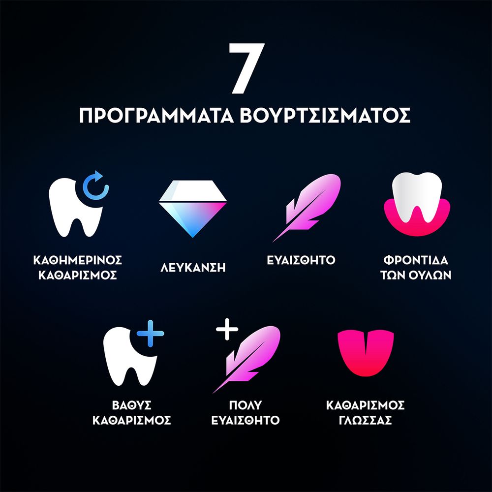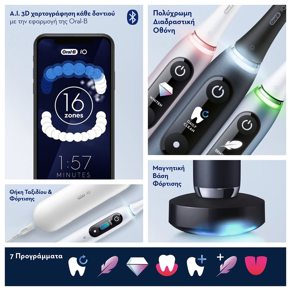 Η Oral-B iO Series 9 Black με την επαναστατική iO τεχνολογία, συνδυάζει τις ισχυρές, αλλά απαλές μικροδονήσεις με τη μοναδική στρογγυλή κεφαλή της Oral-B για επαγγελματικό καθαρισμό κάθε μέρα. Ο εσωτερικός μηχανισμός λειτουργεί με μαγνητικές κινήσεις χωρίς τριβή & θόρυβο, μεταφέροντας μικροδονήσεις στις άκρες των ινών της κεφαλής βουρτσίσματος για ένα εξαιρετικό καθαρισμό.