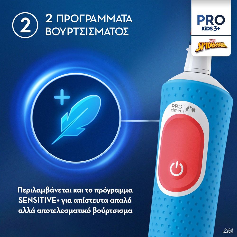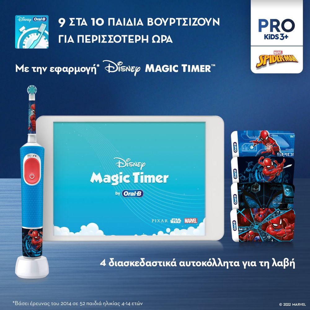 Κάνε το βούρτσισμα πιο διασκεδαστικό με την ηλεκτρική οδοντόβουρτσα Oral-B Vitality Pro Spider-Man! Με 2 προγράμματα, ανάμεσά τους το Sensitive+ για απαλό αλλά αποτελεσματικό καθαρισμό, και πολύ μαλακές ίνες για παιδικά δοντάκια. Περιλαμβάνει 4 αυτοκόλλητα για να διακοσμήσει το παιδί τη λαβή, καθώς και πρακτική θήκη μεταφοράς. Ιδανική για ηλικίες 3+, με κλινικά αποδεδειγμένη προστασία κατά της τερηδόνας!