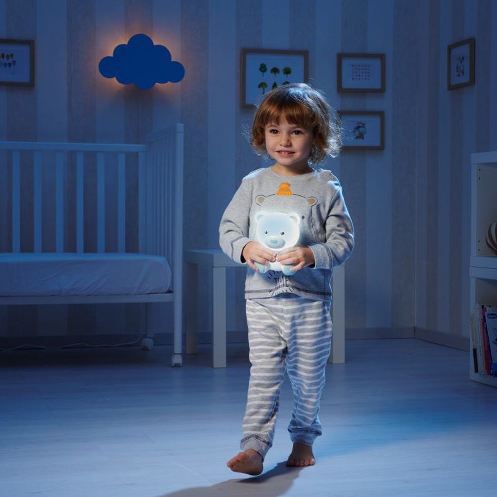 Το φωτάκι νυκτός με σχήμα μπλε αρκουδάκι δημιουργεί μια μαγική λάμψη στο υπνοδωμάτιο του παιδιού βοηθώντας το να χαλαρώσει και να κοιμηθεί. Αναπαράγει 10 λεπτά χαλαρωτικών μελωδιών και κλασικής μουσικής, συνοδεύοντας το μωρό κατά τις πρώτες στιγμές του ύπνου και δημιουργώντας μια γαλήνια ατμόσφαιρα.