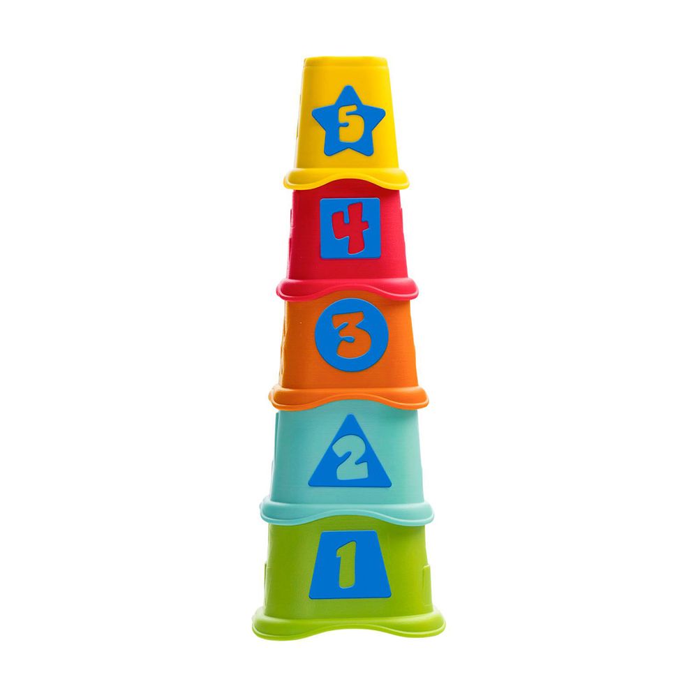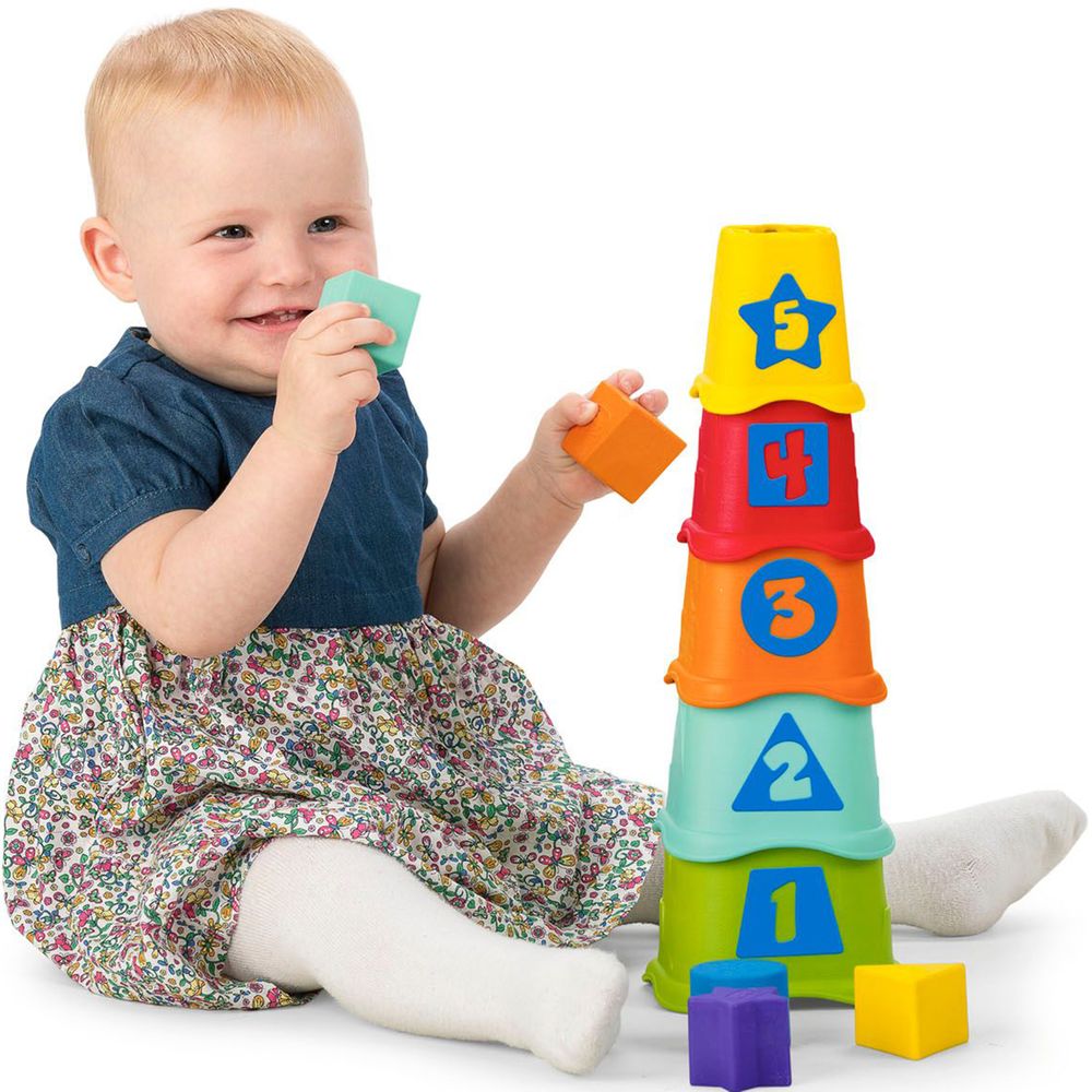 Ιδανικό παιχνίδι για την ανάπτυξη της δημιουργικότητας καθώς το παιδί συντονίζει ταυτόχρονα την όραση και την κίνηση των ματιών. Η παρουσία αριθμών από το 1 έως το 5 που τυπώνονται στο πλάι των κύπελλων επιτρέπει στα παιδιά να μάθουν να υπολογίζουν με έναν απλό τρόπο, αναπτύσσοντας οπτική μνήμη μέσω σχημάτων και χρωμάτων.