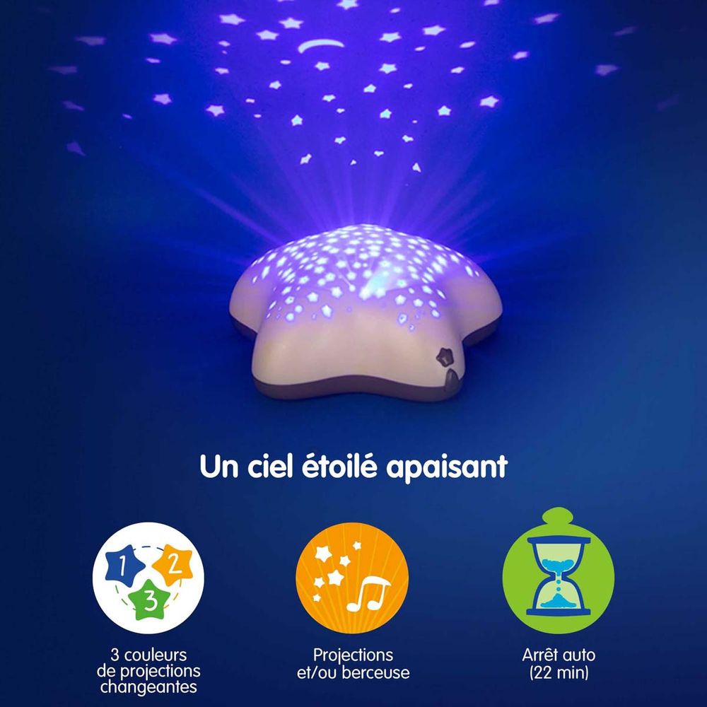 Ο προβολέας αστεριών δημιουργεί έναν όμορφο έναστρο ουρανό στην οροφή για να βοηθήσει τα μωράκια να κοιμηθούν. Τα χρώματα αλλάζουν αργά αλλά είναι επίσης δυνατό να επιλέξεις το αγαπημένο σου χρώμα και να το παγώσεις. ενώ το νυχτερινό φως παίζει ένα απαλό νανούρισμα. Συμπαγές και ασύρματο. μπορεί να εγκατασταθεί οπουδήποτε στο δωμάτιο.
