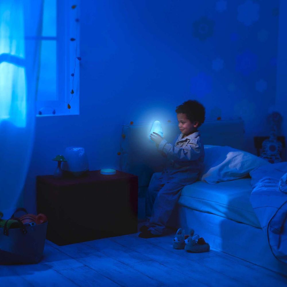 Φωτάκι Νυκτός Lumilove Blue Pabobo που λάμπει απαλά για να καθησυχάσει τα παιδιά πριν τον ύπνο. Χάρη στον ενσωματωμένο χρονοδιακόπτη. το φως της νύχτας σβήνει μόνο του στο τέλος μιας ώρας. ενώ δεν θερμαίνεται και μπορεί να γλιστρήσει με ασφάλεια κάτω από τα σεντόνια. Επαναφορτιζόμενο. με 24 ώρες αυτονομίας. σχεδόν τρεις εβδομάδες απαλού φωτός με μία μόνο φόρτιση.