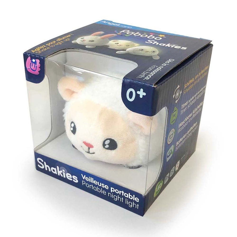 Φωτάκι νυκτός αγκαλιάς Shakies Sheep Pabobo μικρό και ελαφρύ. βελούδινο με κεντημένα ανοιχτά μάτια. Ανακίνησέ το και χάρη στον αισθητήρα κίνησης ανάβει αμέσως. ενώ σταματά αυτόματα μετά από 5 δευτερόλεπτα ή 5 λεπτά. Το καθησυχαστικό και πολύ απαλό φως δεν θερμαίνει ούτε κάτω από τα σεντόνια. ενώ το υφασμάτινο προβατάκι μπορεί να αφαιρεθεί από τον προβολέα και να πλυθεί εύκολα στο πλυντήριο.