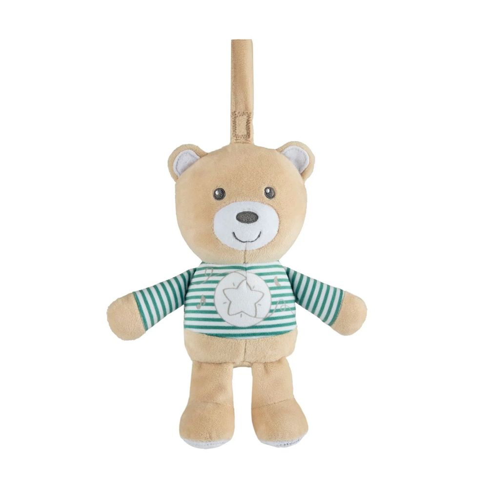 Το απαλό αρκουδάκι με βελούδινη υφή, διασκεδάζει και χαλαρώνει το μωρό με ελαφριά και μελωδικά εφέ. Πιέζοντας την κοιλιά του ενεργοποιείται το φως και οι μελωδίες διάρκειας περίπου 15 λεπτών. Χάρη στον πρακτικό ιμάντα είναι δυνατό να στερεώσετε το προϊόν στην κούνια ή στο καρότσι του μωρού για να το συνοδεύει οποιαδήποτε στιγμή της ημέρας. Το ηλεκτρονικό μέρος του παιχνιδιού μπορεί να αφαιρεθεί για να πλυθεί το προϊόν στο πλυντήριο και να προσφέρει στο παιδί ένα παιχνίδι που είναι πάντα καθαρό.
