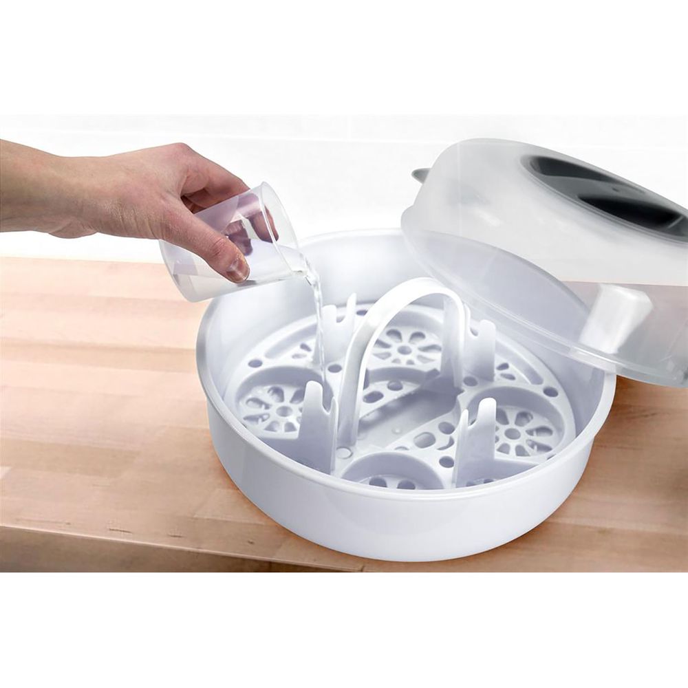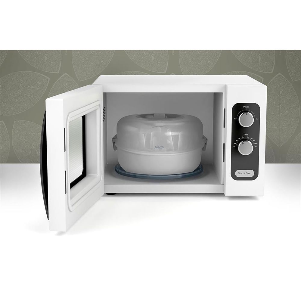 Αποστειρωτής μπιμπερό κατάλληλος για φούρνο μικροκυμάτων. Αποστειρώνει γρήγορα και εύκολα χωρίς τη χρήση απορρυπαντικών εξουδετερώνοντας το 99,9% των βακτηριδίων. Λειτουργεί με νερό βρύσης και είναι εύκολος στο άνοιγμα με στο καθάρισμα ενώ το περιεχόμενο με κλειστό το καπάκι παραμένει αποστειρωμένο για 24 ώρες. Χωράει μέχρι 4 μπιμπερό των 150 ml και μεταφέρεται εύκολα για τα ταξίδια σου. Τέλος, περιλαμβάνεται δοσομετρητής 120 ml και λαβίδα.