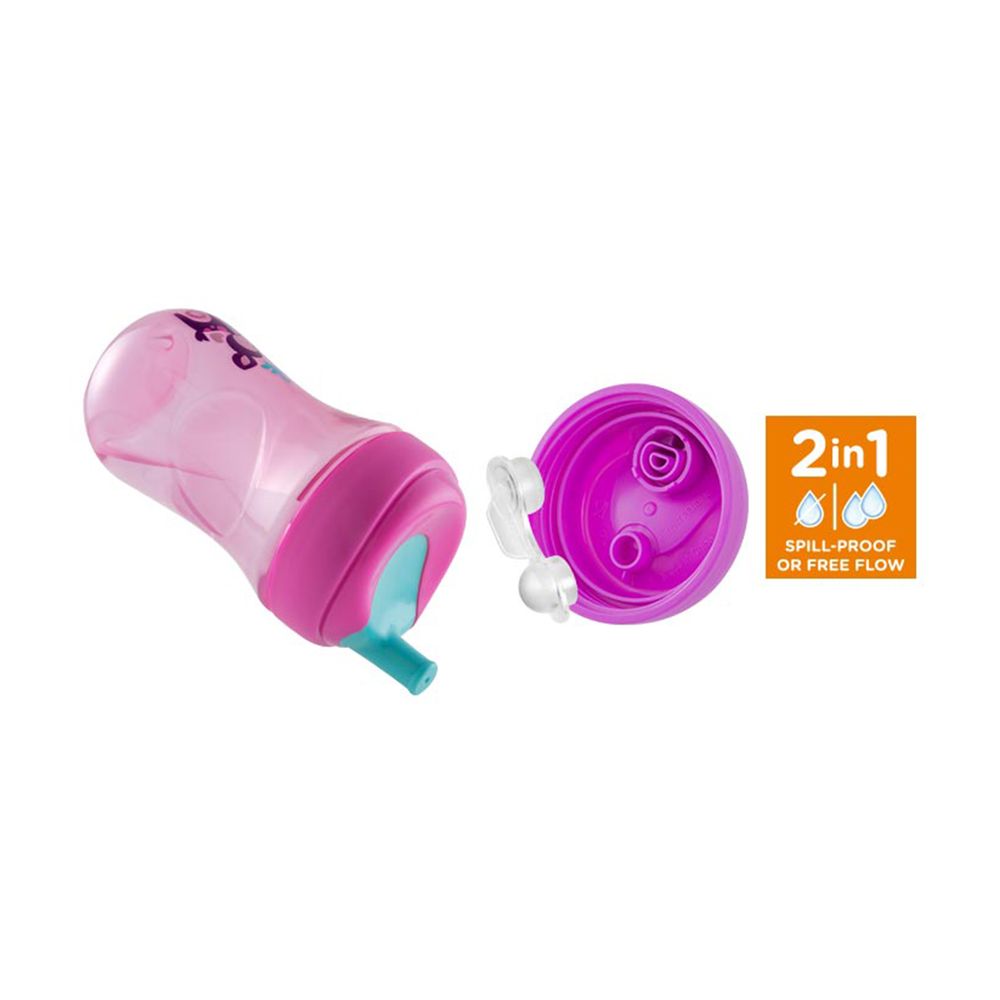 Μαλακό καλαμάκι με εκπαιδευτικό στόμιο, ανθεκτικό στο δάγκωμα και με κυλινδρικό σχήμα που σταδιακά βοηθά στη μετάβαση στο κανονικό καλαμάκι. Επίσης, το σχήμα του στομίου διευκολύνει τη σωστή τοποθέτηση των χειλιών του παιδιού και προωθεί τη σωστή στάση του αυχένα κατά την πόση. Έχει εργονομικό σχήμα ποτηριού με κοίλωμα στην κορυφή για να μην ενοχλεί τη μύτη. Επιπλέον, διαθέτει αφαιρούμενη εύκαμπτη βαλβίδα, πατέντα που καθιστά το κύπελλο 100% ανθεκτικό στις διαρροές, για εύκολη πόση.