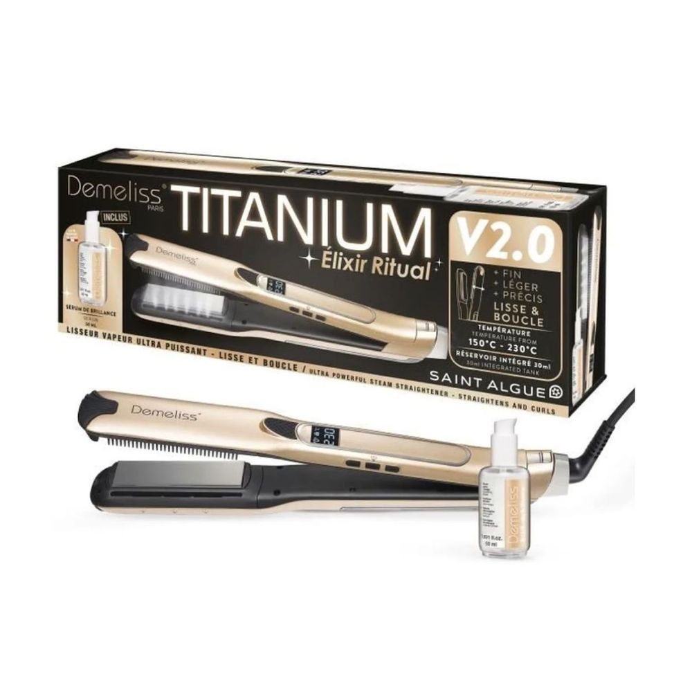Με το ισιωτικό μαλλιών Demeliss Titan V2 Elixir Ritual, ανακάλυψε την απόλυτη εμπειρία styling! Ισιώνεις ή δημιουργείς μπούκλες με τις στενές πλάκες (9x2,5 cm) με επίστρωση από τιτάνιο και στρογγυλεμένες άκρες, ενώ η προαιρετική λειτουργία ατμού προσφέρει λείανση απο τη ρίζα, ακόμα και σε κοντά μαλλιά. Ρύθμισε θερμοκρασία από 150˚C έως 230˚C, απόλαυσε γρήγορη θέρμανση, εργονομία, ασφάλεια και θρέψη με το Elixir De Brillance. Για λαμπερά, υγιή μαλλιά κάθε μέρα!