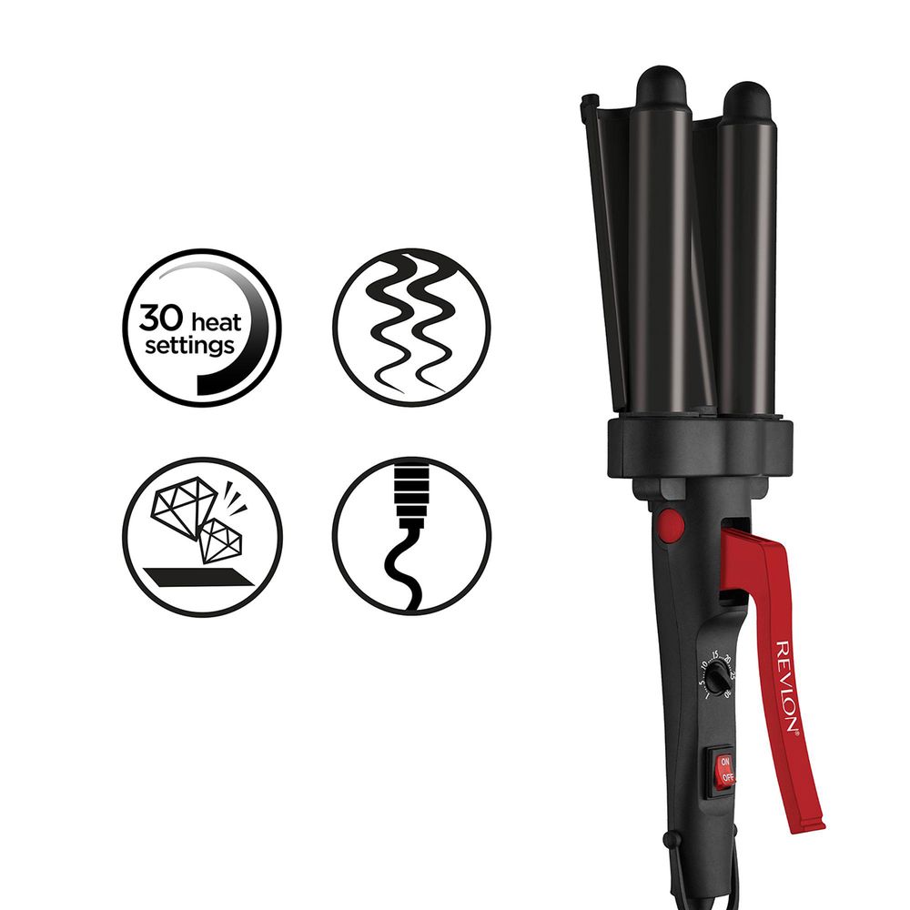 Απόκτησε υπέροχους κυματισμούς στα μαλλιά σου με το Revlon Wave Master. Η τεχνολογία Tourmaline Ceramic-Coated βοηθά στη δημιουργία ενός κομψού και εντυπωσιακού στυλ με ελάχιστη φθορά, ενώ οι 30 μεταβλητές ρυθμίσεις θερμότητας παρέχουν εύκολη προσαρμογή. Διαθέτοντας σχεδιασμό με τρεις κυλίνδρους το Revlon Wave Master κάνει το styling γρήγορο και εύκολο. Με περιστρεφόμενο καλώδιο, δακτύλιο χειρό και κλειδαριά πλάκας για ασφαλή και γρήγορη αποθήκευση.