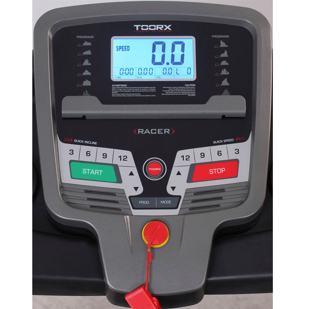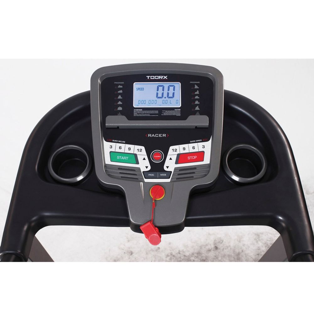 Διάδρομος γυμναστικής Toorx Racer HRC 04-432-20 με οθόνη LCD 113 x 63 mm με οπίσθιο μπλε φωτισμό, πλήκτρα ελέγχου ταχύτητας & κλίσης, μέτρηση καρδιακών παλμών με αισθητήρες παλάμης στις χειρολαβές και στήριγμα για smartphone ή tablet.