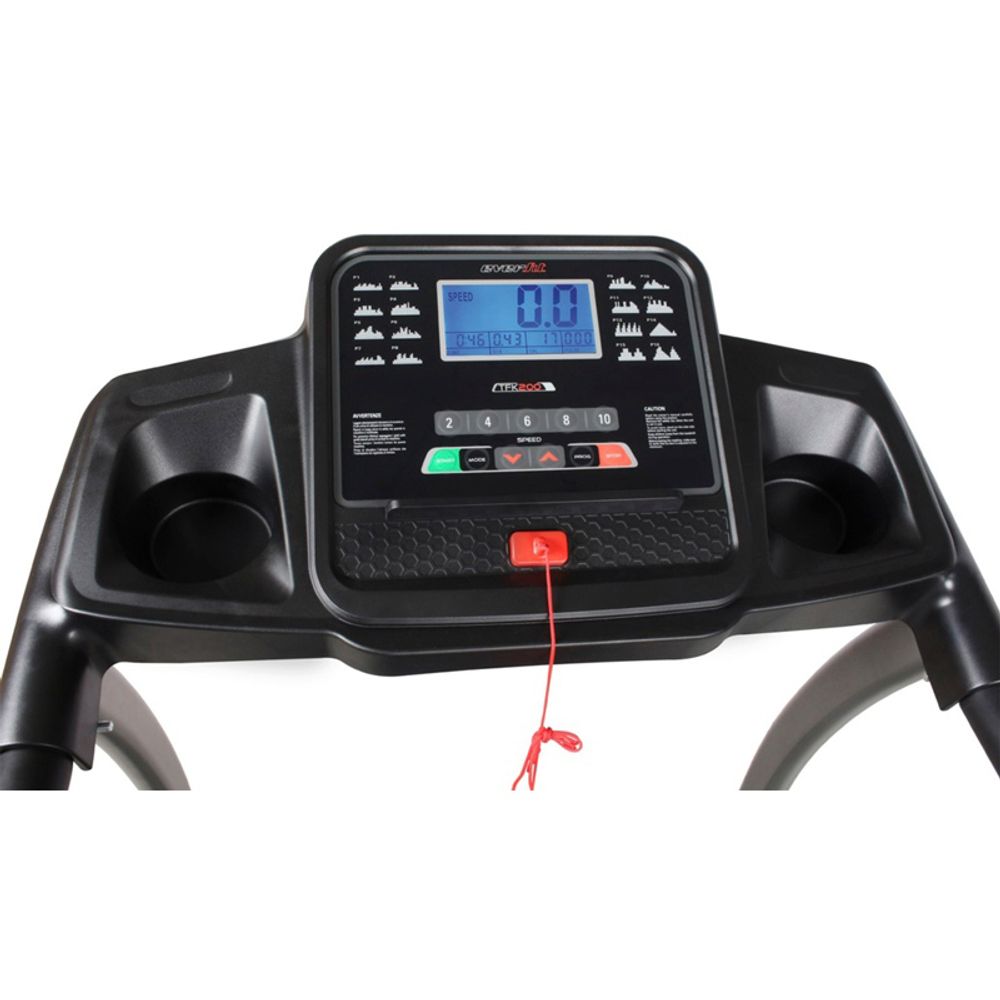 Διάδρομος γυμναστικής Everfit TFK-200 Plus με οθόνη LCD 11 x 6 cm με οπίσθιο μπλε φωτισμό, πλήκτρα ελέγχου ταχύτητας & έναρξης/παύσης, μέτρηση καρδιακών παλμών με αισθητήρες παλάμης και στήριγμα για smartphone ή tablet.