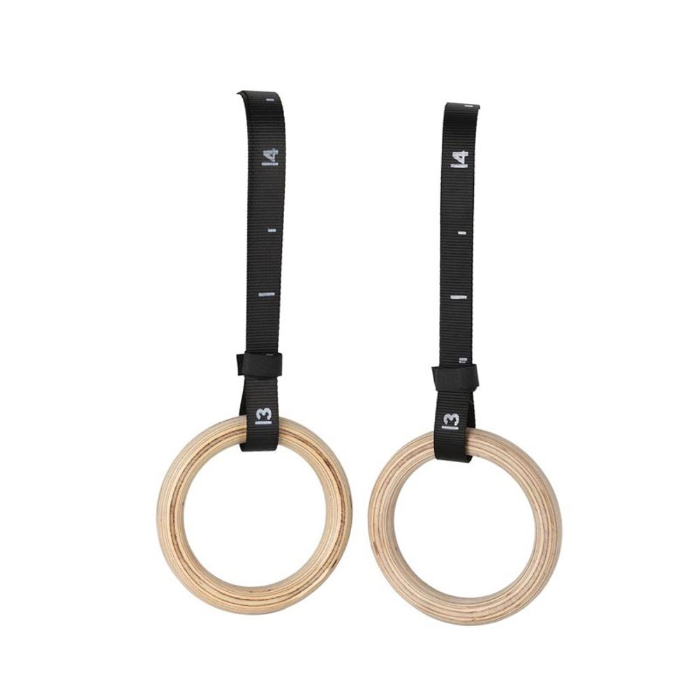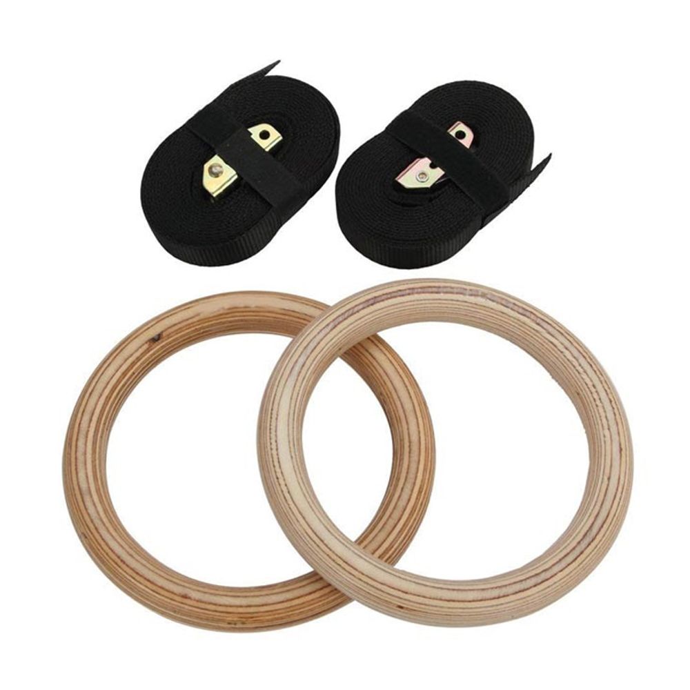 Ζευγάρι ξύλινων κρίκων γυμναστικής με ρυθμιζόμενους ιμάντες. Διαστάσεις: μήκος 457 cm, πλάτος 2.55 cm (ιμάντας) & διάμετρος κρίκων 24 cm