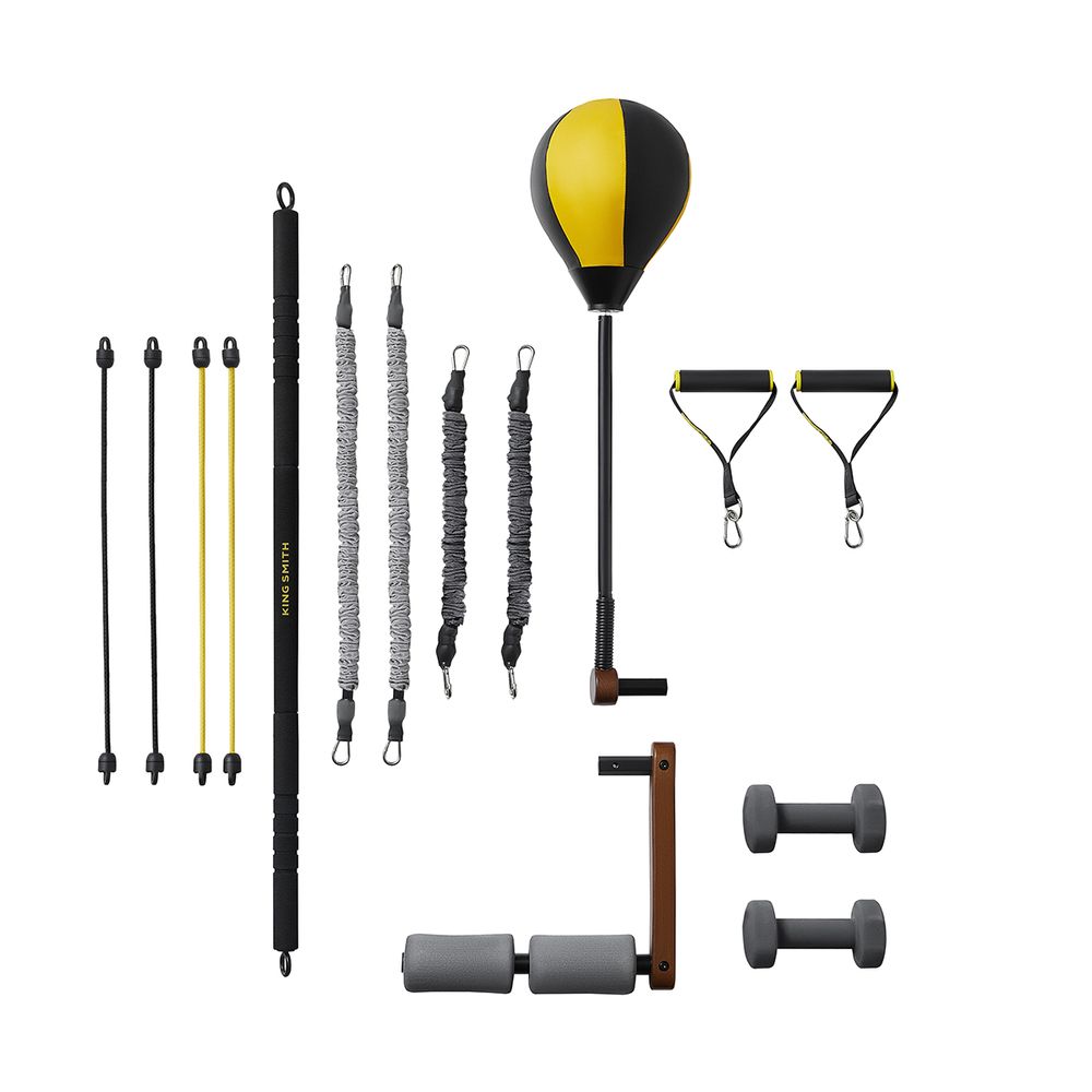 2 πολυλειτουργικές λαβές, Σχοινιά αντίστασης 2 x 10 kg και 2 x 20 kg, 2 x 8 kg και 2 x 16 kg ελαστικά σχοινιά με διπλό άγκιστρο, 2 x 3 κιλά αλτήρες, 1 ενσωματωμένη μπάρα προπόνησης, 1 ευκίνητη μπάλα διάτρησης, 1 βραχίονας ισορροπίας βασικής προπόνησης