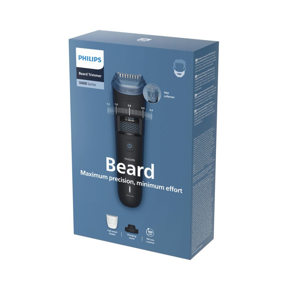 Τρίμαρε με ακρίβεια και άνεση με το Beard Trimmer 5000. Οι αυτοακονιζόμενες λεπίδες και το σύστημα συλλογής τριχών κάνουν την περιποίηση πιο εύκολη από ποτέ. Με τεχνολογία BeardSense για έξτρα ισχύ όταν τη χρειάζεσαι και σχεδιασμό για καθαρό, ομοιόμορφο αποτέλεσμα.