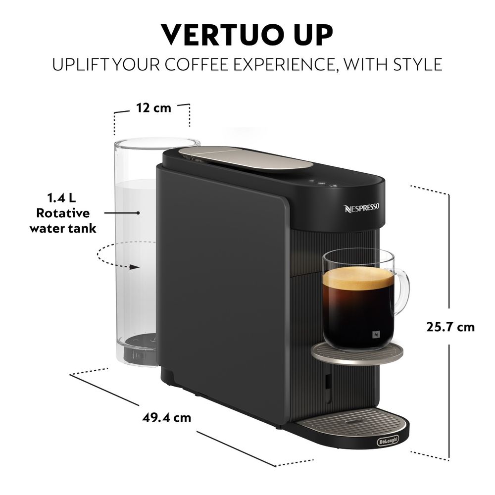 Η Nespresso Vertuo Up συνδυάζει λεπτό, σύγχρονο σχεδιασμό με πρακτικότητα και παρασκευάζει τον αγαπημένο σου καφέ όπως τον θέλεις. Πάτησε το κουμπί Coffee Creations για έντονο παγωμένο καφέ ή λαχταριστή συνταγή με γάλα. Συνδέσου με την εφαρμογή Nespresso Smart App για να προσαρμόζεις θερμοκρασία και μέγεθος φλιτζανιού, να λαμβάνεις ειδοποιήσεις, να απλοποιείς τη συντήρηση και να ακολουθείς συνταγές βήμα-βήμα. Οποιοσδήποτε καφές, οποιοδήποτε μέγεθος, ατελείωτοι συνδυασμοί με ένα πάτημα κουμπιού.