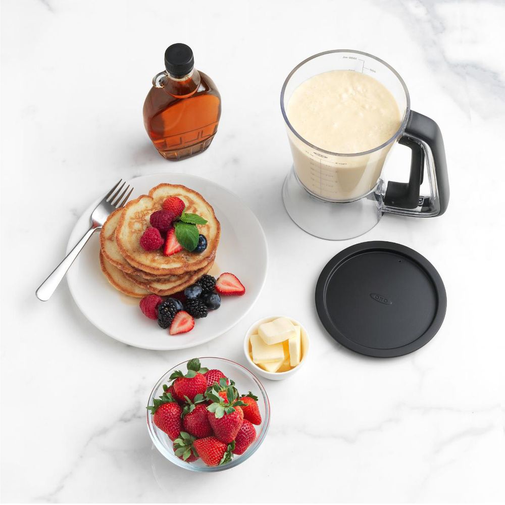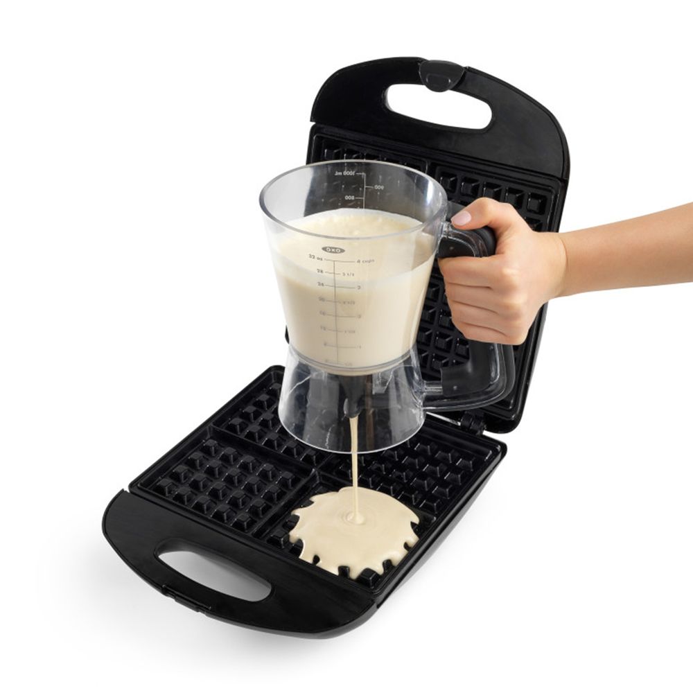 Διανεμυτής ζύμης, ένα πρακτικό αξεσουάρ κουζίνας για να φτιάξεις σπιτικές κρέπες και τηγανίτες. Επιτρέπει την ακριβή δοσολογία της ποσότητας της πάστας που πρέπει να χυθεί. Η σκανδάλη είναι ενσωματωμένη στη λαβή απελευθερώνει την πάστα από την κάτω πλευρά, με την απλή πίεση του χεριού. Η βαλβίδα διακοπής σιλικόνης κλείνει αμέσως για την αποφυγή διαρροών και υπερχείλισης. Ο διανομέας OXO παρέχεται με καπάκι, το οποίο λειτουργεί επίσης ως δίσκος συλλογής υγρών. Με χωρητικότητα 1 λίτρου.