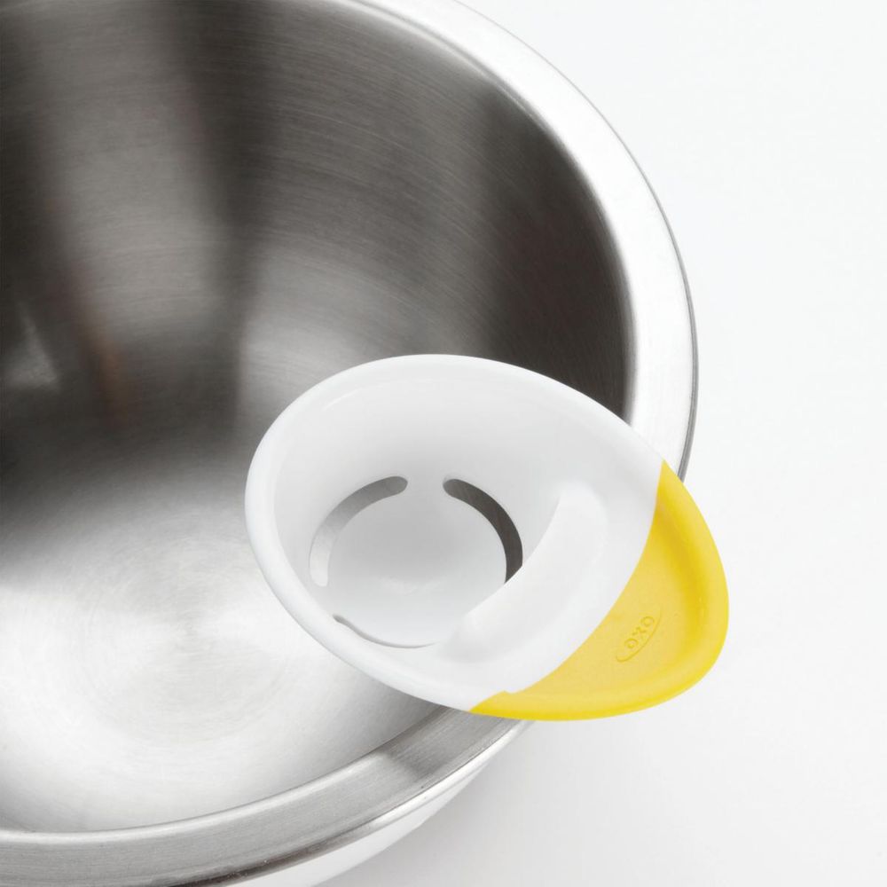 Στερέωσε το διαχωριστή αυγών στο πλάι ενός μπολ και διαχώρισε με άνεση τον κρόκο από το ασπράδι του αυγού. Η βάση πιάνει κομμάτια από το κέλυφος και εμποδίζει τα αυγά να στάζουν στον πάγκο. Διαθέτει δύο διαφορετικές ραβδώσεις για να χωράει είτε σε μπολ με λεπτό ή χοντρό πλαίσιο.