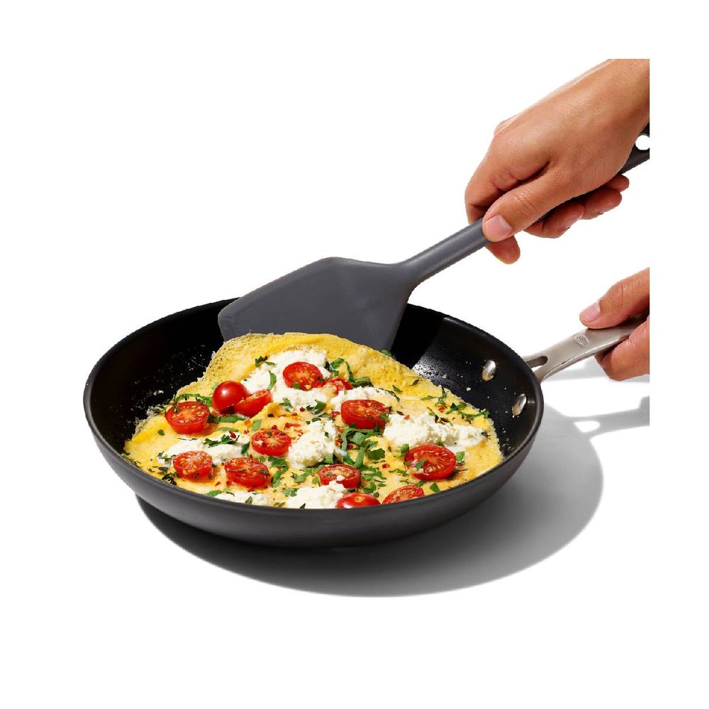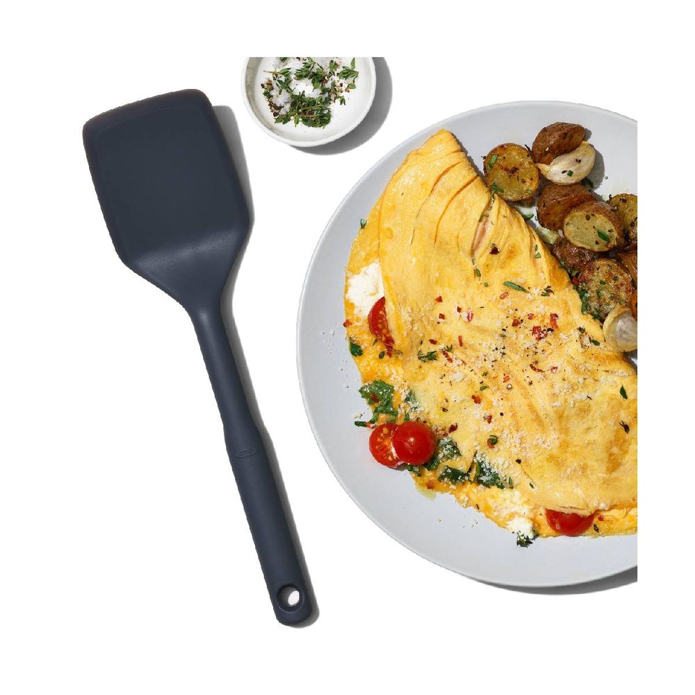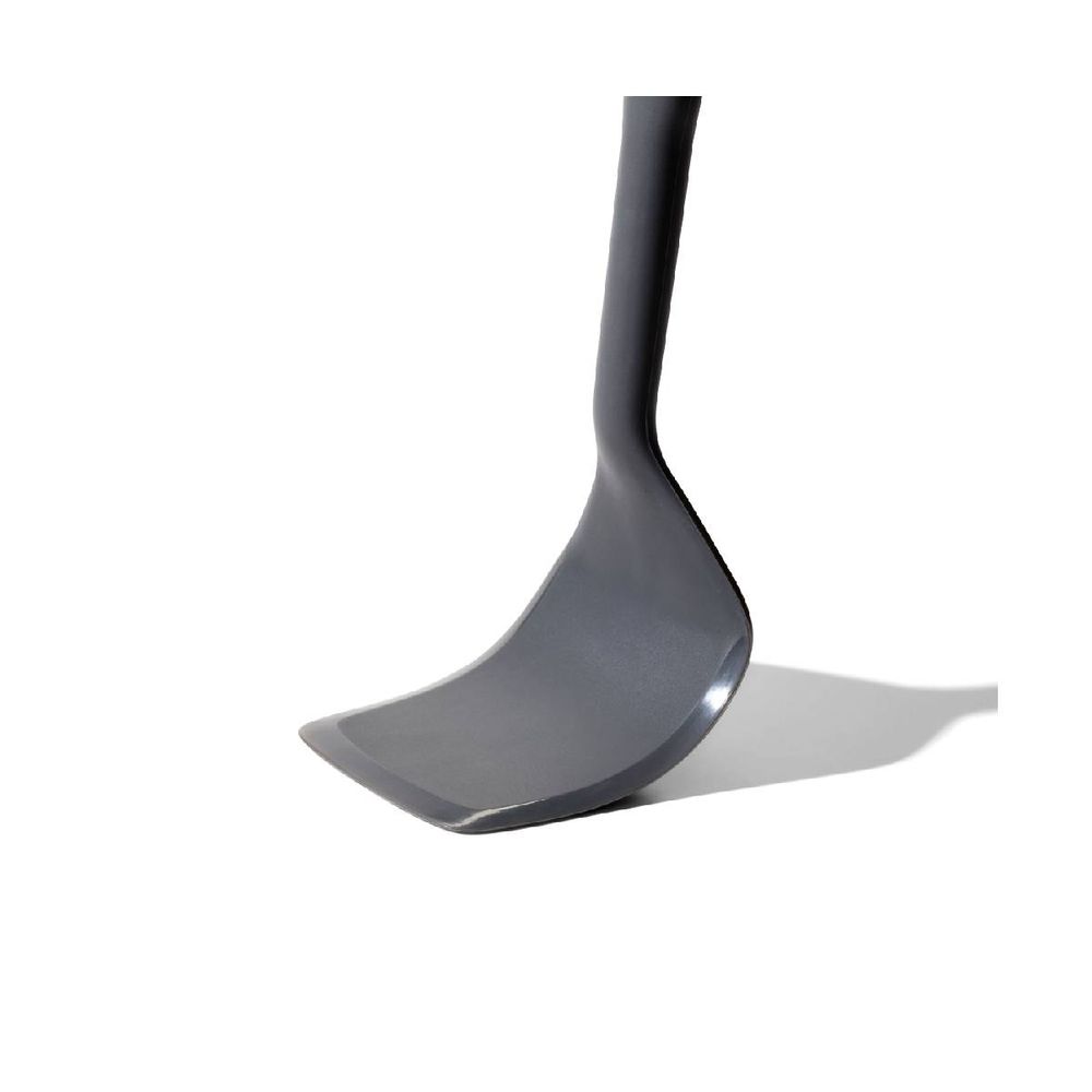 Σπάτουλα Οxo ειδικά σχεδιασμένη και για μικρά τηγάνια. Κατασκευασμένη από ανθεκτική σιλικόνη για χρήση σε σκεύη όπως κατσαρόλες που μόλις βγήκαν από τη φωτιά. Μπορεί να τοποθετηθεί και στο πλυντήριο πιάτων.