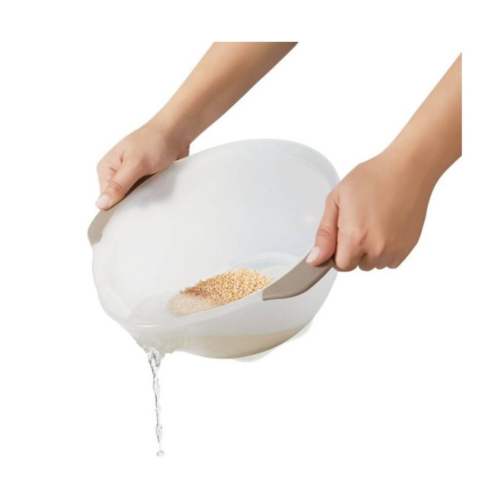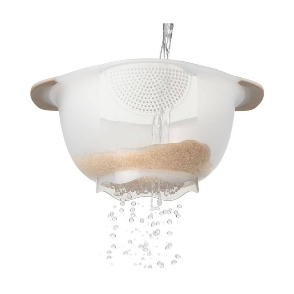 Το σουρωτήρι Oxo έχει σχεδιασμένες τις τρύπες με τέτοιο τρόπο ώστε να στραγγίζει και να ξεπλένει αργά το ρύζι , τα όσπρια, το κινόα καθώς επίσης να μην ξεφεύγει κανένας κόκκος. Τα νερά πριν αποστραγγιστούν συγκεντρώνονται για να δείξουν πότε το νερό είναι καθαρό. Οι πλαϊνές μαλακές αντιολισθητικές λαβές βοηθούν στην ανακίνηση του.