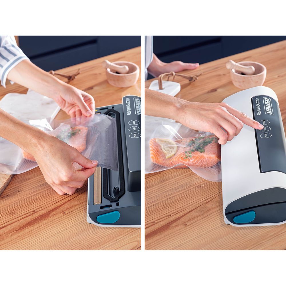 Σακουλοποιός τροφίμων Leifheit με ισχύ 80W για σακούλες έως 30 cm, που σου επιτρέπει να συσκευάζεις και να αποθηκεύεις οποιοδήποτε είδος τροφής, με λειτουργία σφράγισης που προστατεύει από τον αέρα και διατηρεί φρέσκα τα τρόφιμα.
