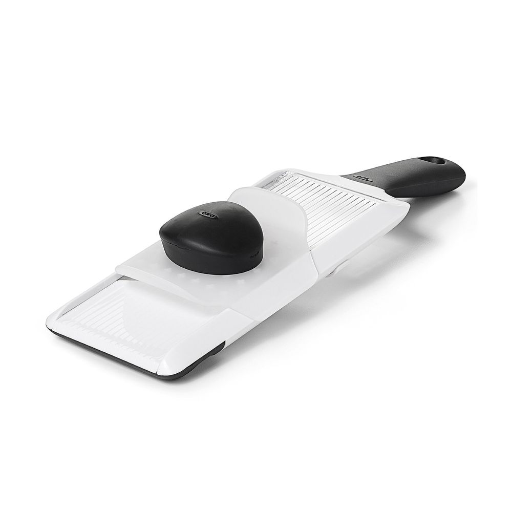 Το μαντολίνο Oxo Good Grips Handheld είναι ιδανικό για γρήγορο και ομοιόμορφο κόψιμο λαχανικών και φρούτων. Διαθέτει ρυθμιζόμενη λεπίδα από ανοξείδωτο ατσάλι για τρεις διαφορετικές πάχους φέτες και αντιολισθητική λαβή για άνετη χρήση. Είναι ασφαλές για το πλυντήριο πιάτων και περιλαμβάνει προστατευτικό για τα χέρια.
