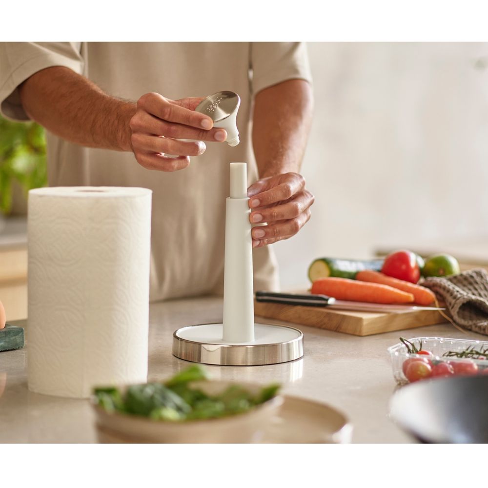 Η Joseph Push&Tear είναι μια πρακτική θήκη ρολού κουζίνας που σου επιτρέπει να κόβεις χαρτί εύκολα ακόμα κι όταν έχεις τα χέρια σου γεμάτα. Διαθέτει καπάκι με ελατήριο που κρατά το ρολό στη θέση του, ανυψωμένο χείλος στη βάση για να μην ξετυλίγεται, και σταθερή αντιολισθητική βάση. Το καπάκι αφαιρείται εύκολα για γέμισμα, ενώ είναι κατάλληλη για ρολά ύψους έως 24 cm.