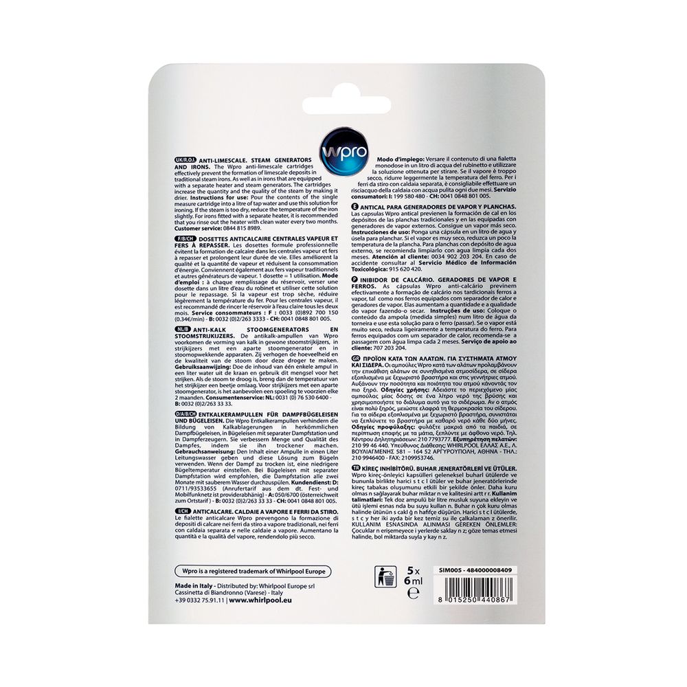 Αμπούλες καθαρισμού Wpro που αποτρέπουν αποτελεσματικά τον σχηματισμό αλάτων στα σίδερα και αυξάνουν την ποιότητα και ποσότητα ατμού, κάνοντάς τον πιο στεγνό.