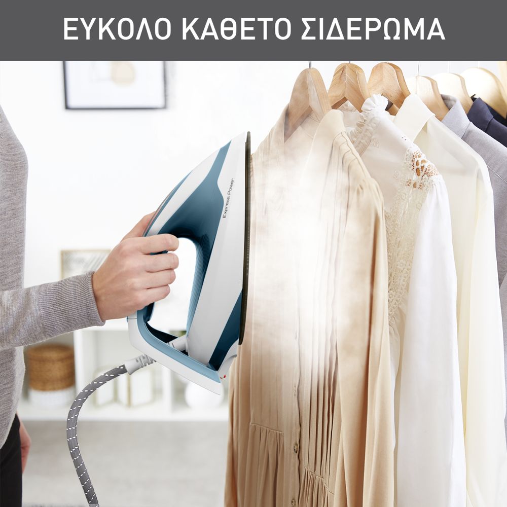 Το Tefal Express Power σύστημα σιδερώματος εξασφαλίζει εύκολη φροντίδα των υφασμάτων στη στιγμή, συνδυάζοντας τα πρακτικά χαρακτηριστικά με την ασύγκριτη ισχύ ατμού: συνεχής παραγωγή ατμού 120 gr/min, ισχυρή εκτόξευση ατμού 430 gr/min για επίμονες ζάρες και πίεση αντλίας 6.2 bar για άψογα αποτελέσματα καθημερινά. Με τα βελτιωμένα χαρακτηριστικά του, η φροντίδα των υφασμάτων γίνεται ευκολότερη.
